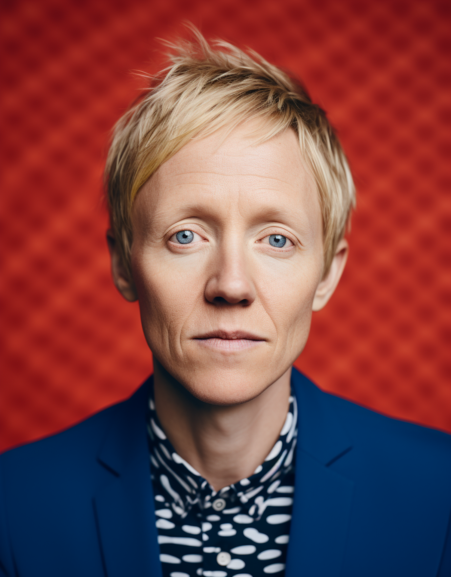 Caucasian person with short blonde hair in a blue blazer against a red textured background, looking directly at the camera.
