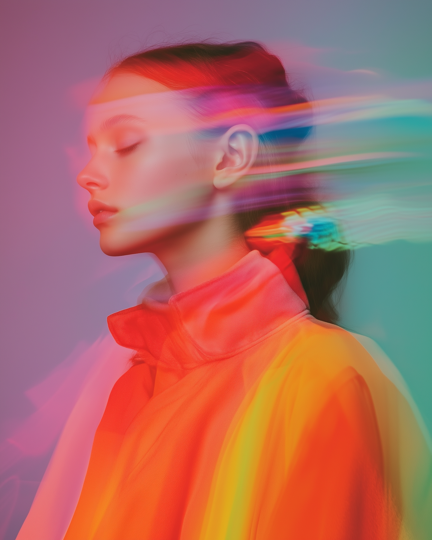 A serene woman in vibrant orange with dynamic, colorful motion blur creating an ethereal effect.