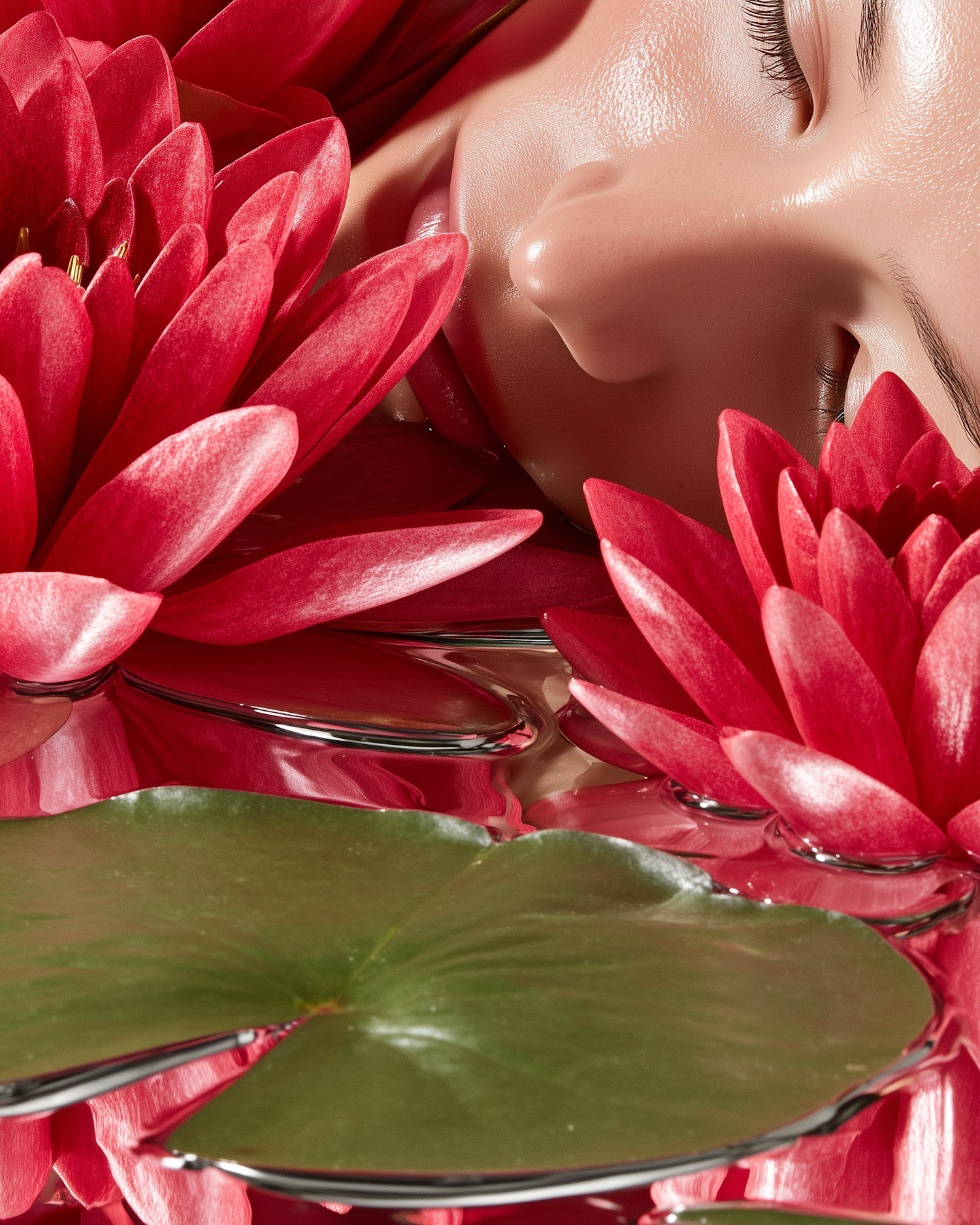 A serene face surrounded by vibrant red water lilies and green lily pads, creating a tranquil and artistic composition.