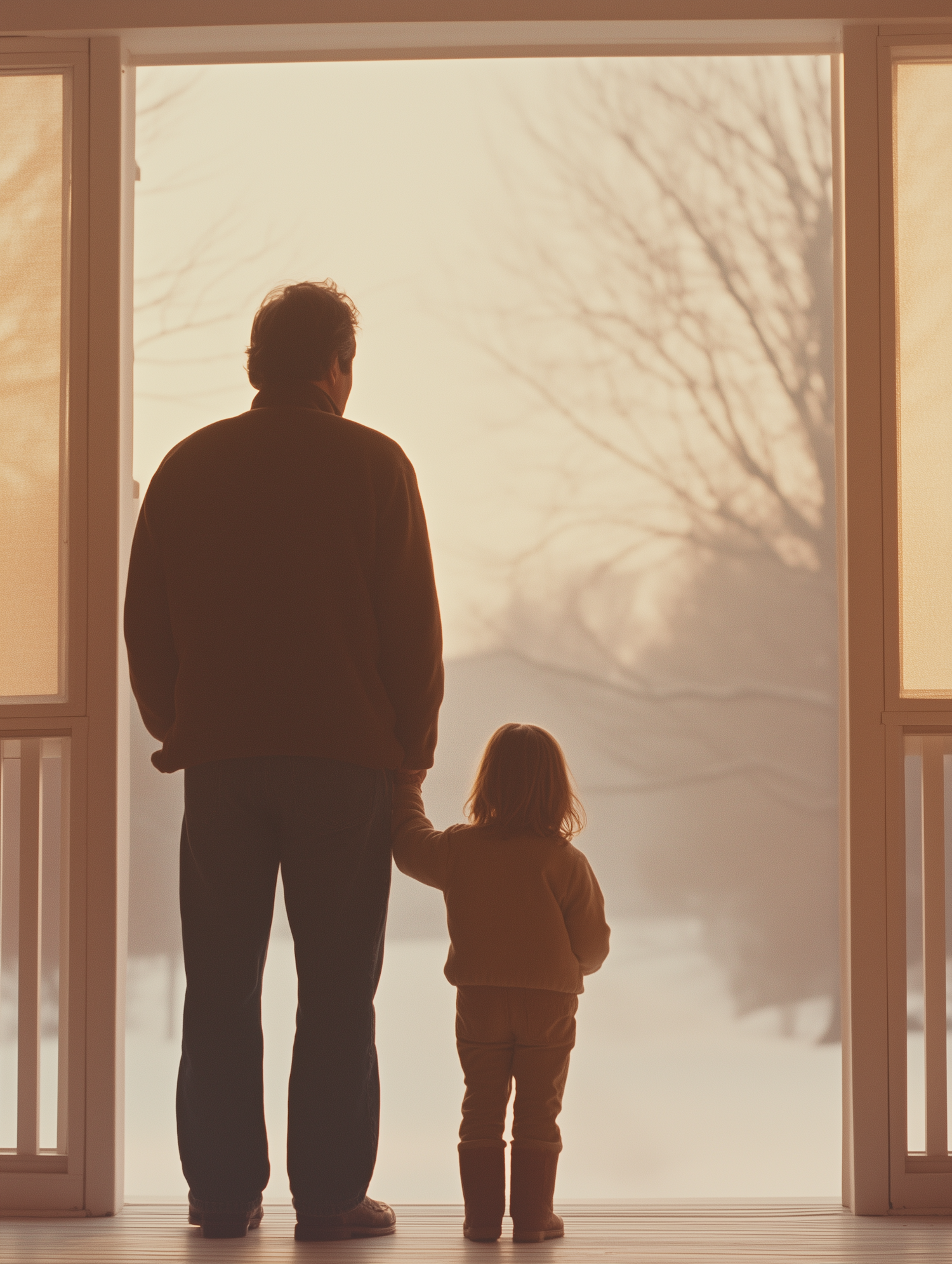 A man and child stand hand in hand, gazing out a window at a winter scene, bathed in warm light, creating a peaceful, intimate moment.