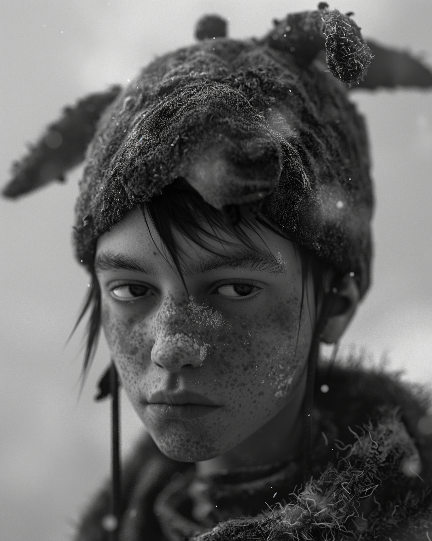 Black and white portrait of a freckled person in a furry hat with snowflakes, capturing a wintry, contemplative mood.