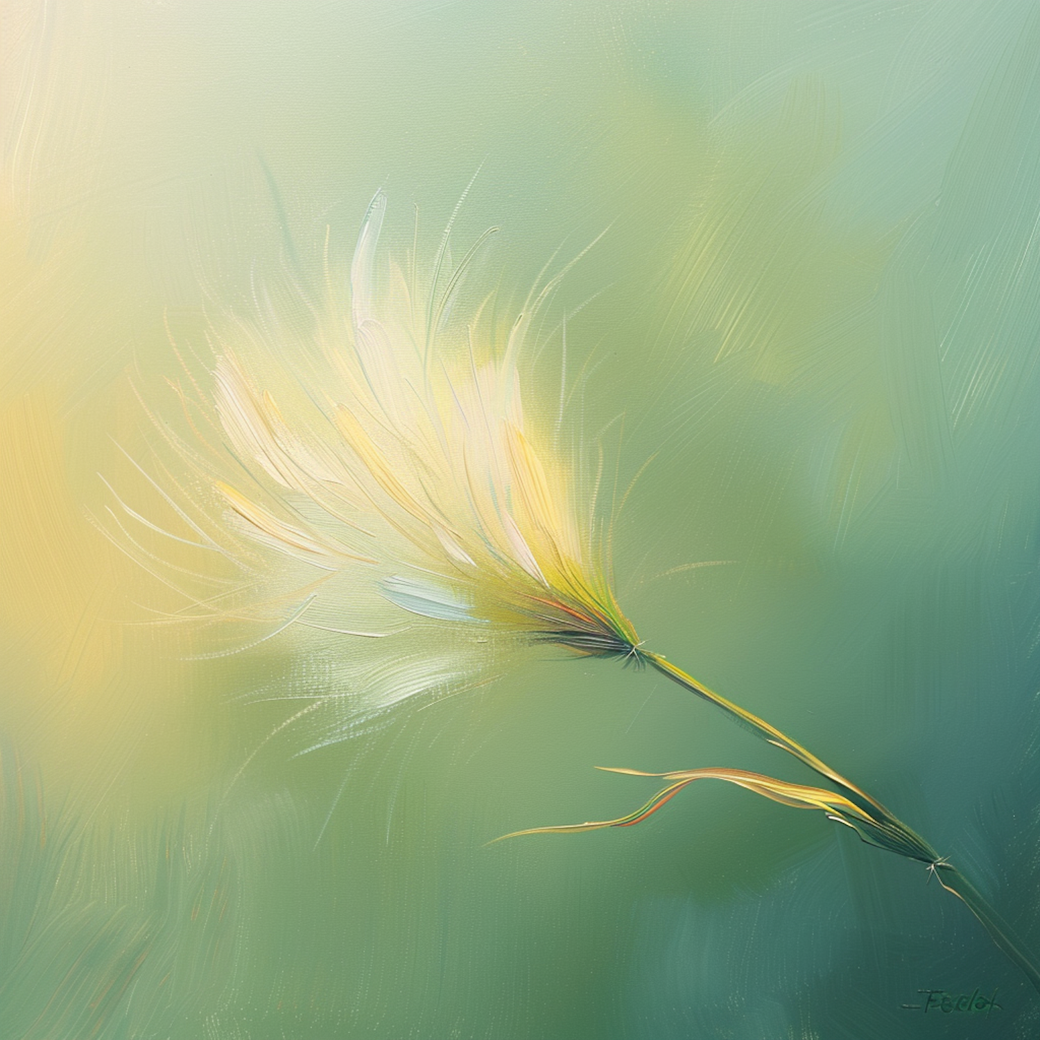 Abstract painting of a feather-like structure with soft green background, featuring delicate strokes in white, yellow, and blue hues.