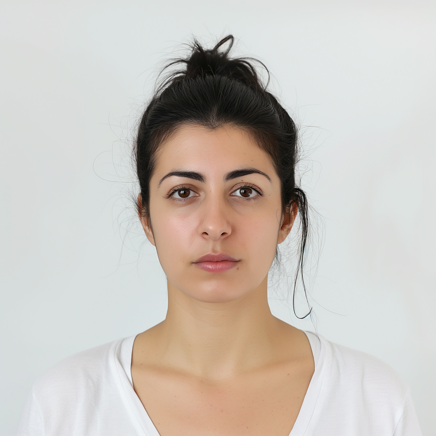 Portrait of a woman with dark hair in a bun, wearing a white shirt, against a plain white background.