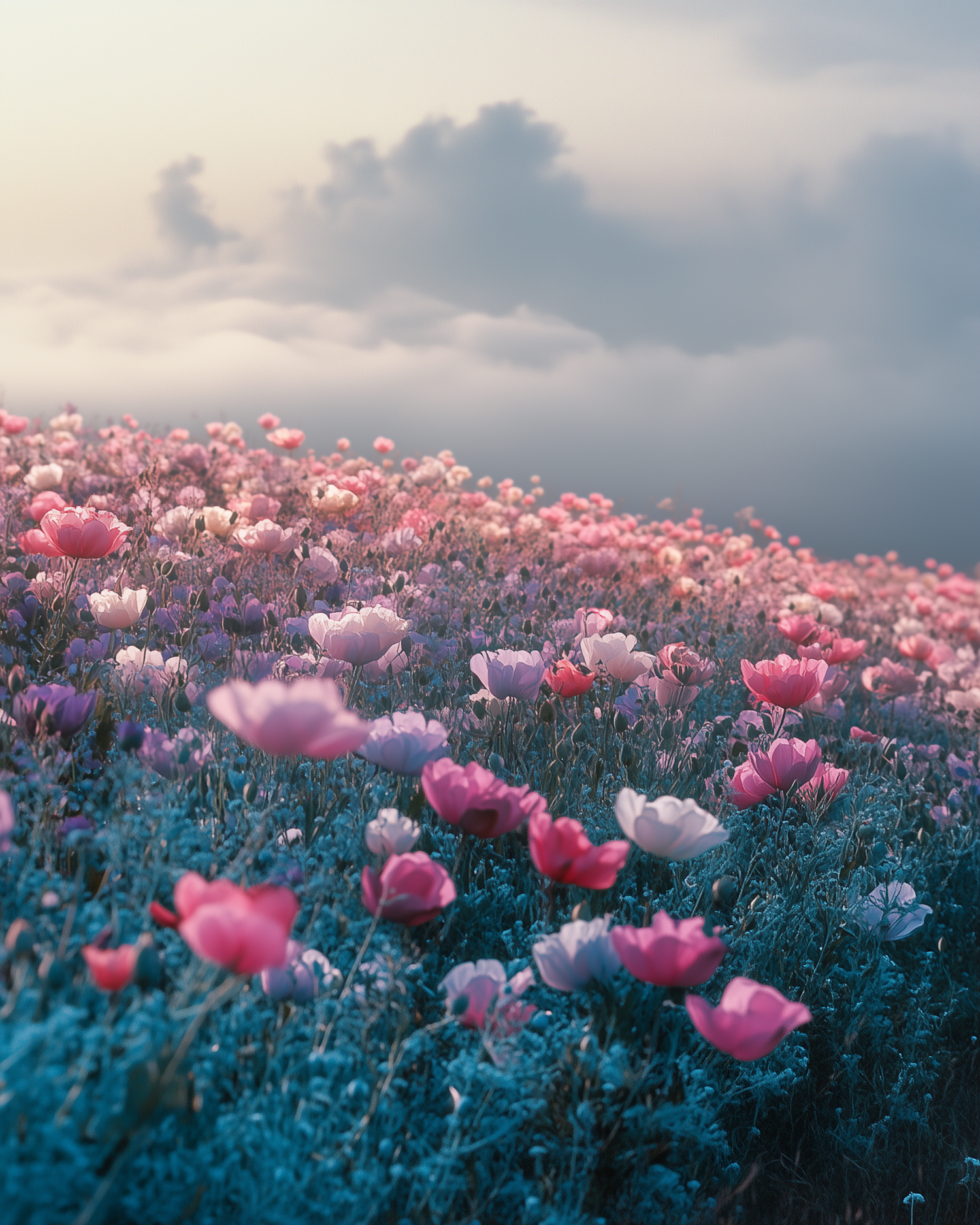 A dreamy field of pink and white flowers under a cloudy sky, creating a serene and tranquil atmosphere.