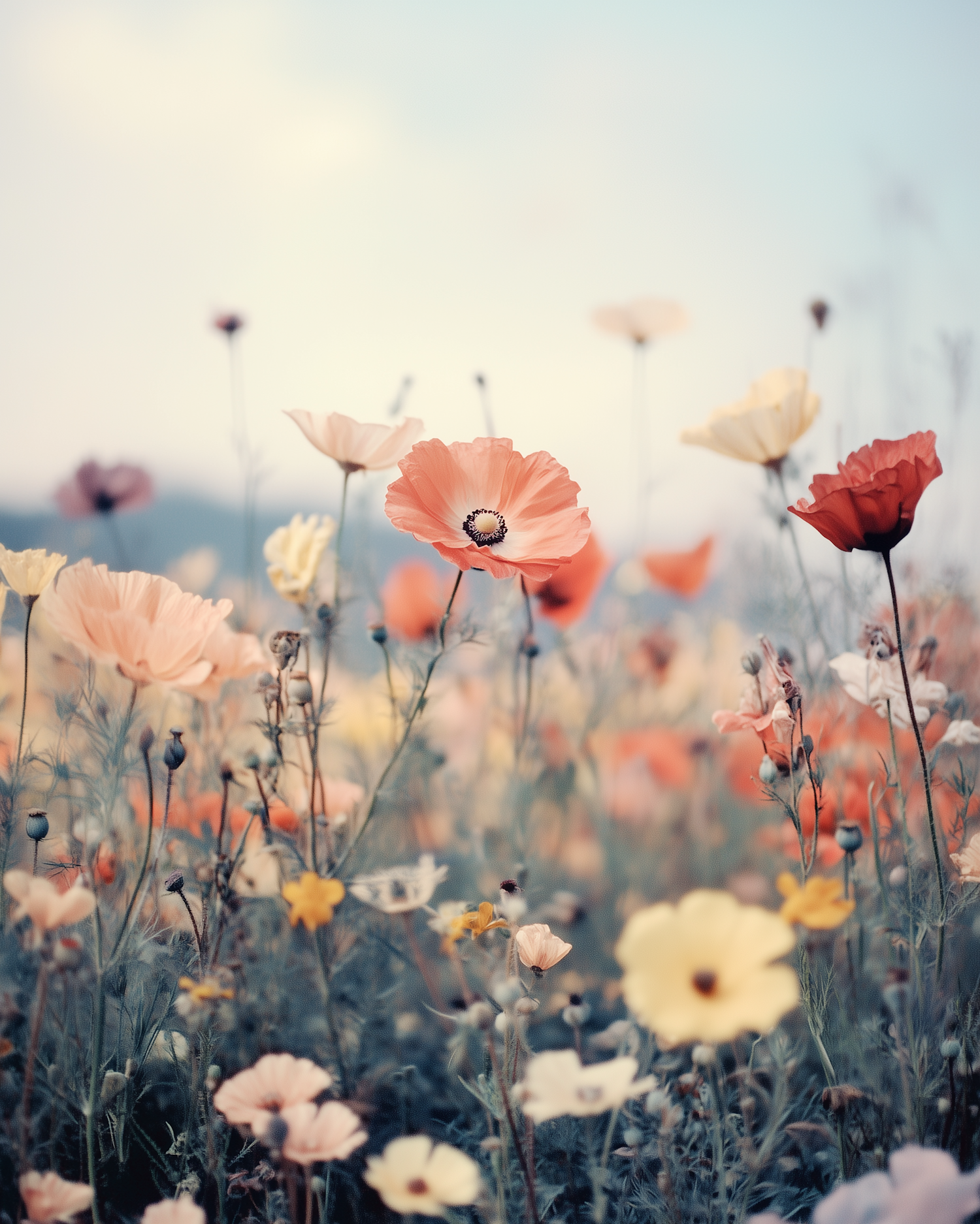 A dreamy field of pastel poppies in soft focus, creating a serene and ethereal atmosphere with delicate colors and gentle light.