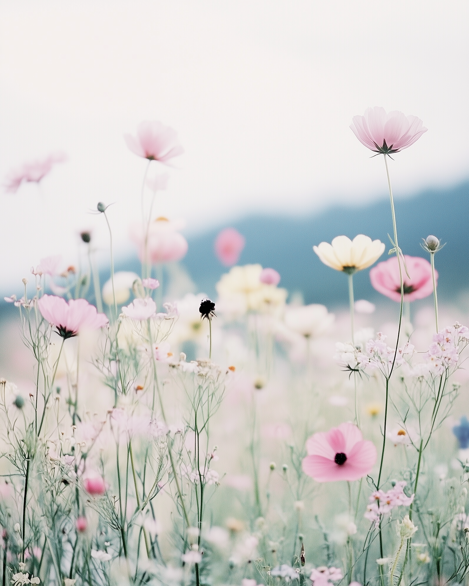 A dreamy field of pink and white wildflowers with a soft, blurred background and a single dark flower for contrast.