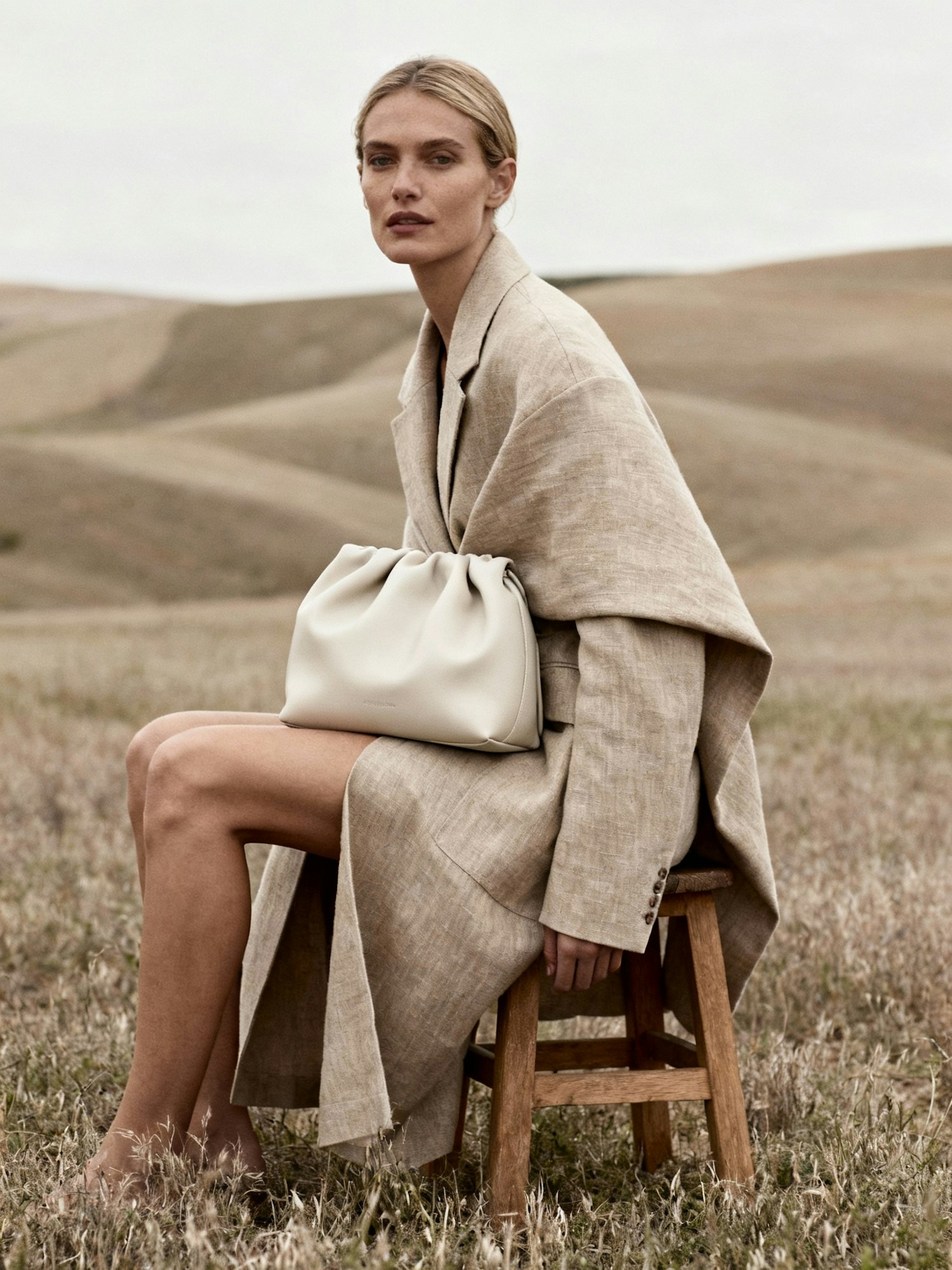 A woman in a beige coat sits on a stool in a serene field, holding a cream handbag, blending with the natural tones of the landscape.