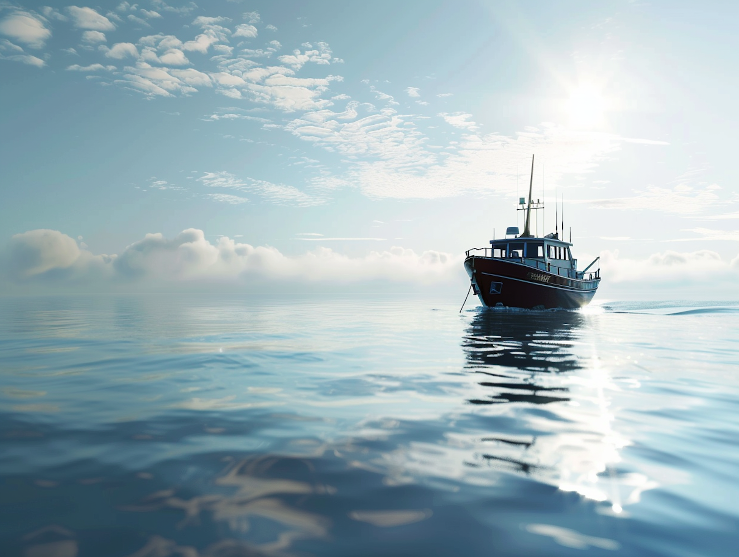 A fishing boat sails on a calm ocean under a clear sky, with sunlight reflecting on the water's surface, creating a serene scene.
