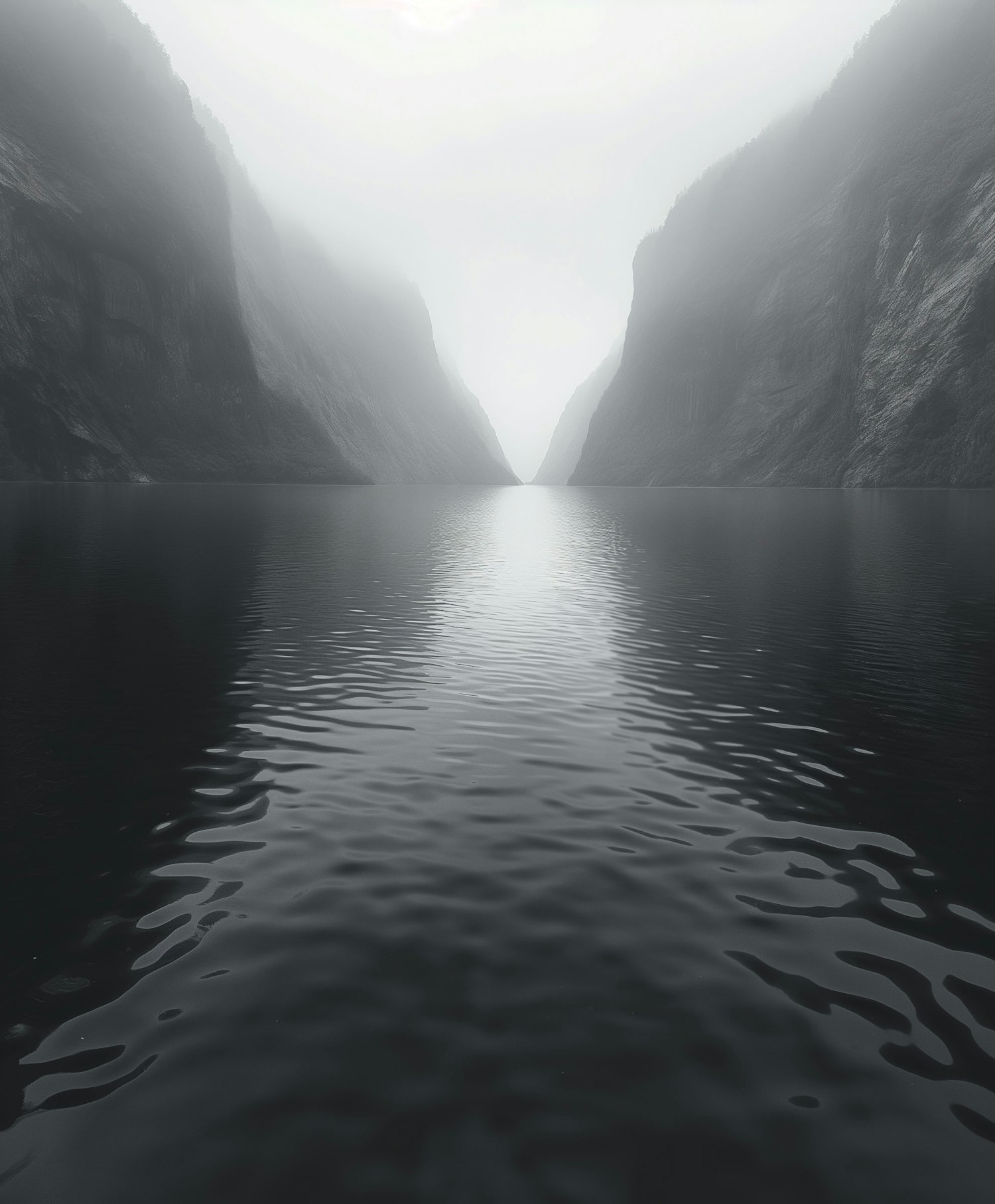 Misty fjord with towering cliffs and calm waters, creating a serene and monochromatic landscape.
