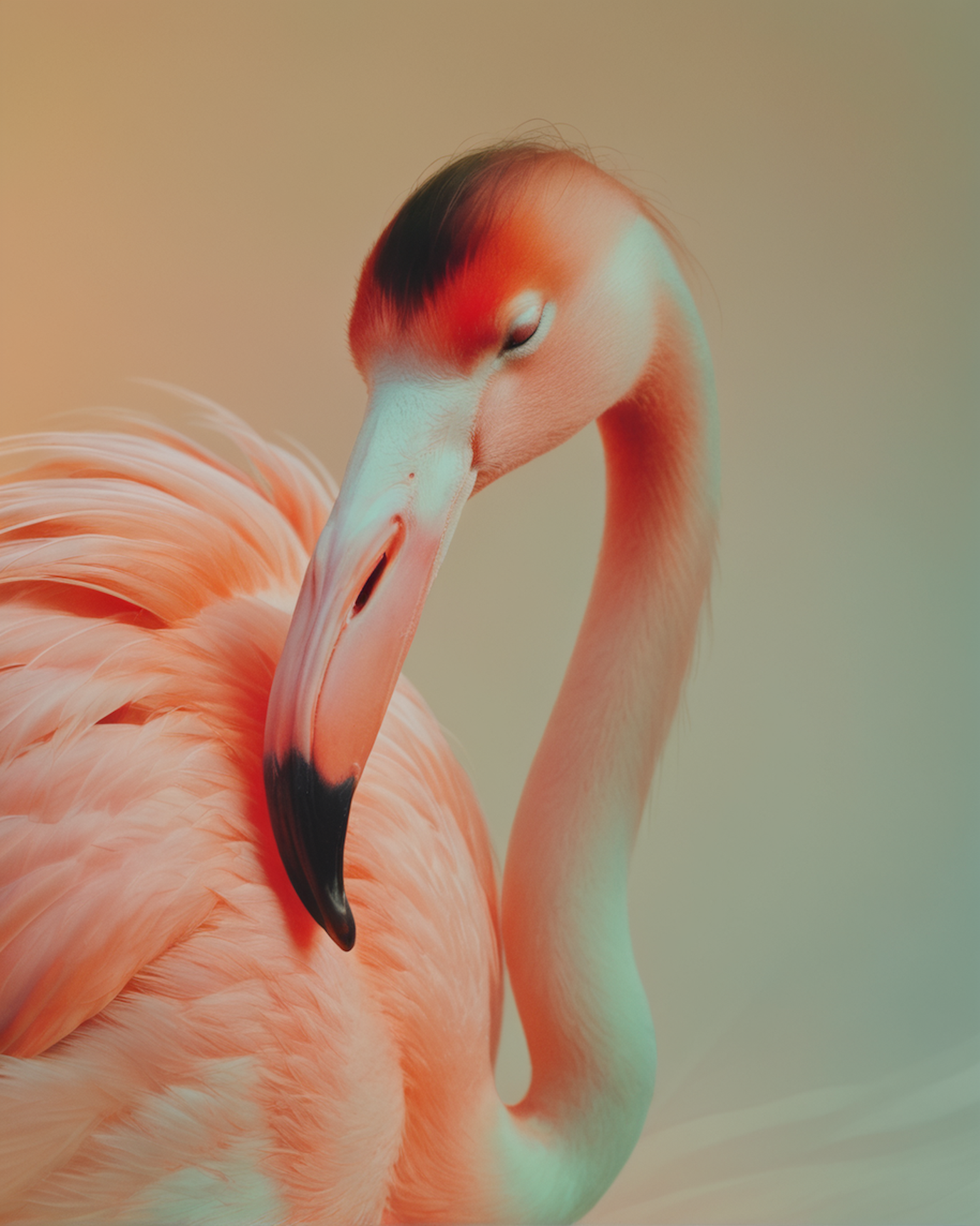 Close-up of a flamingo with vibrant pink feathers and a striking black-tipped beak, set against a pastel gradient background.