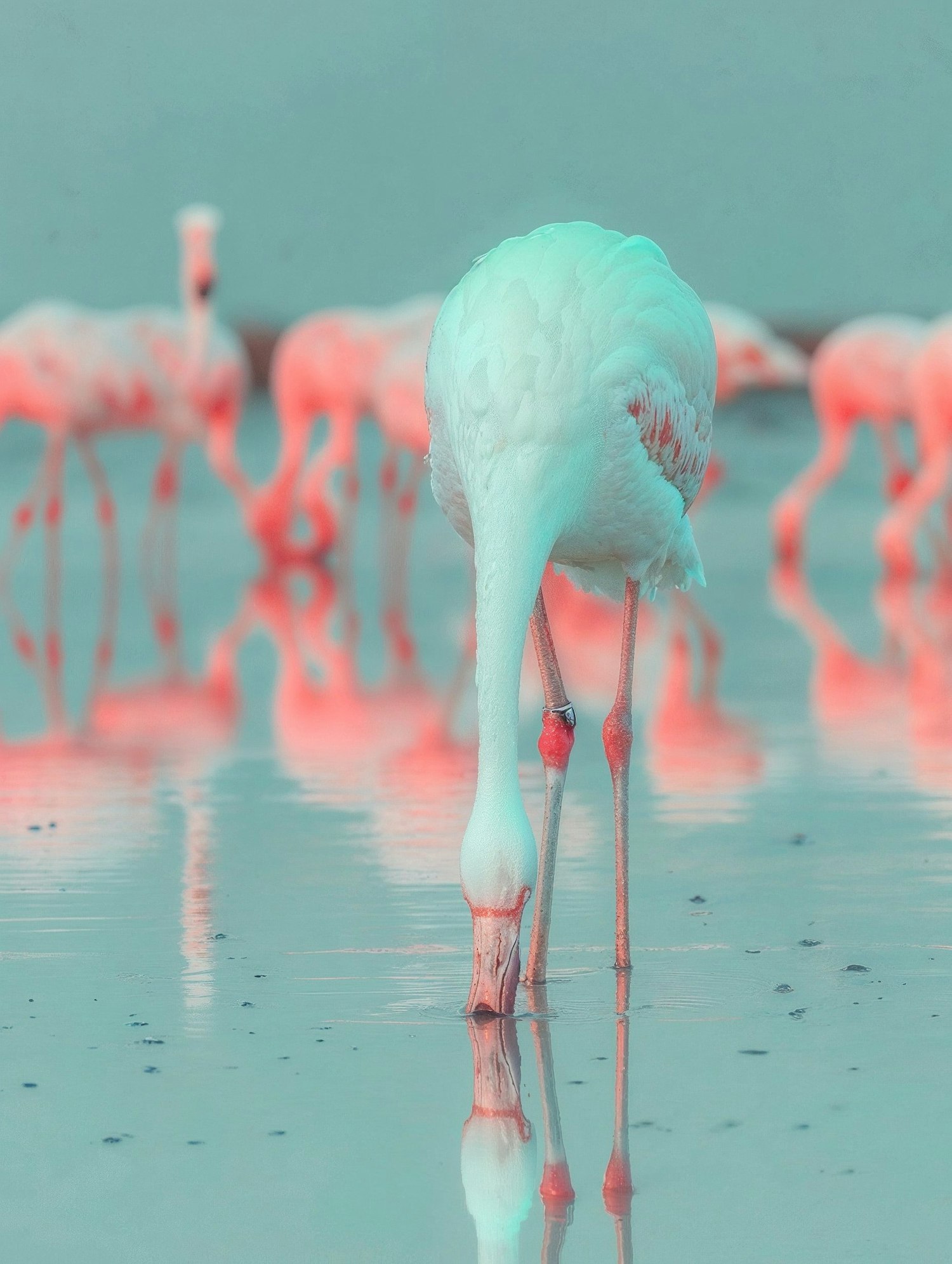 A flamingo drinks from reflective water, surrounded by a pastel landscape of blues and pinks, creating a serene and ethereal scene.