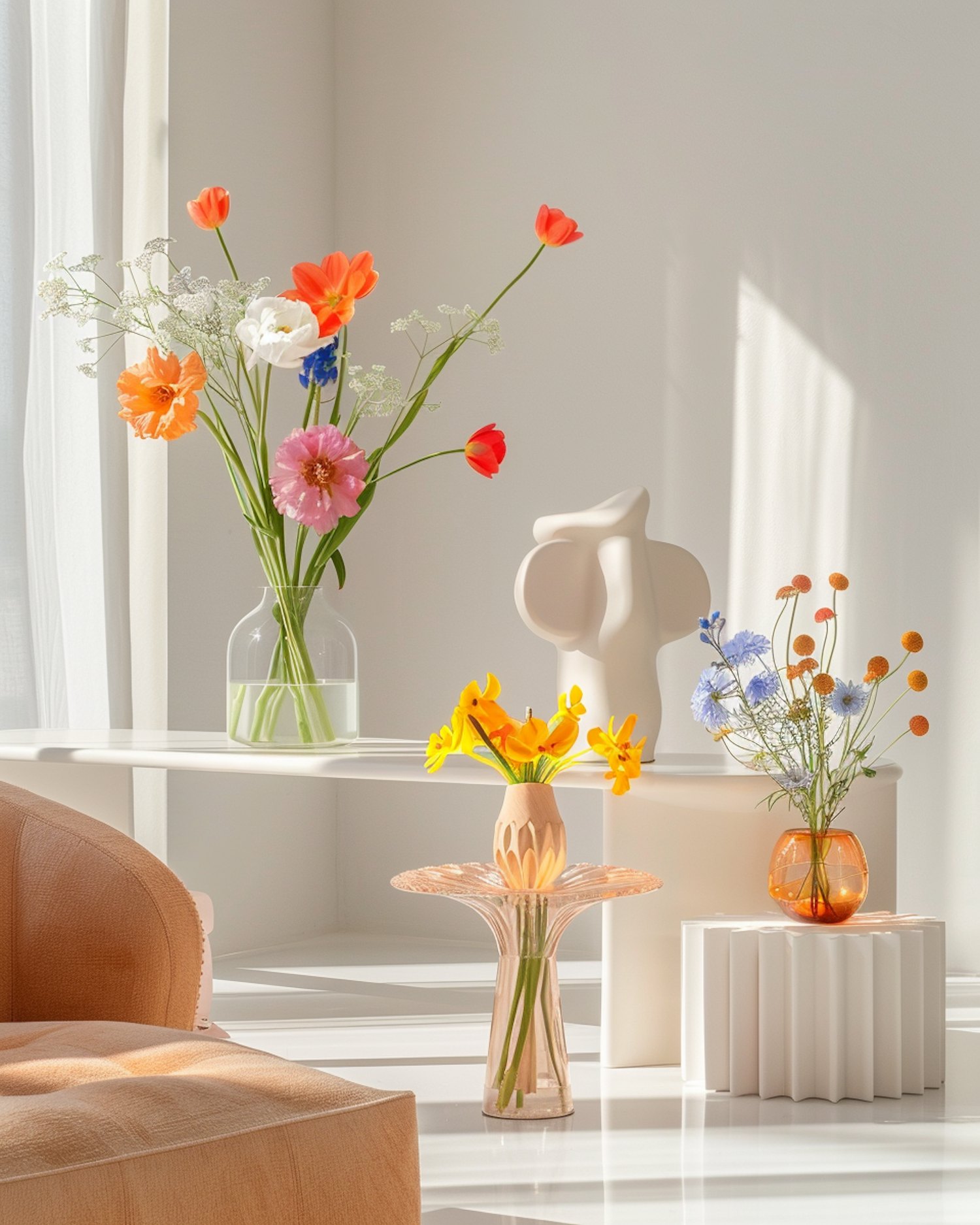 Bright room with colorful flowers in elegant vases, modern sculpture, and soft natural light creating a serene atmosphere.