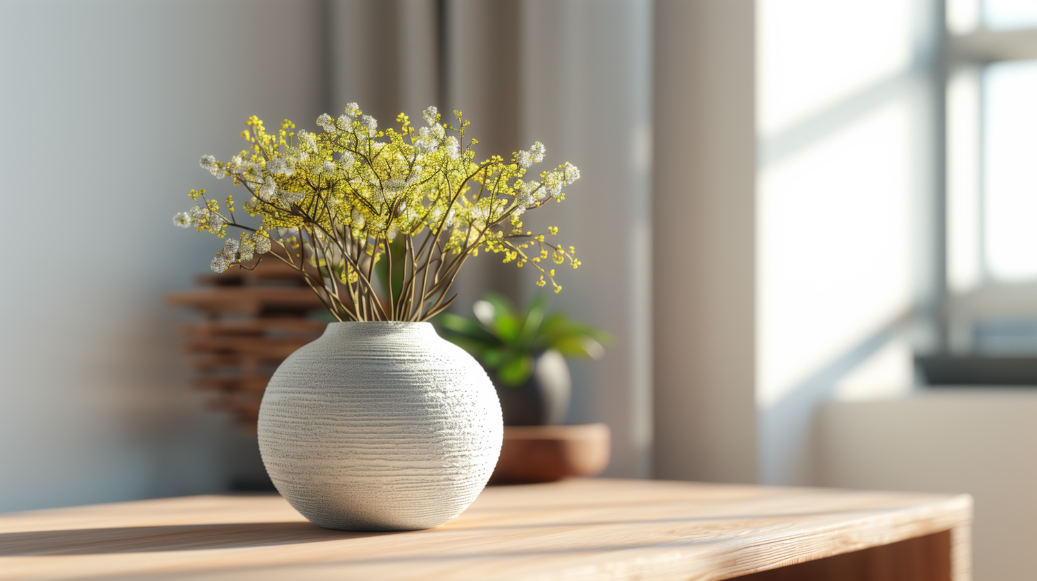 A ceramic vase with yellow and white flowers on a sunlit wooden table, creating a serene and natural ambiance.