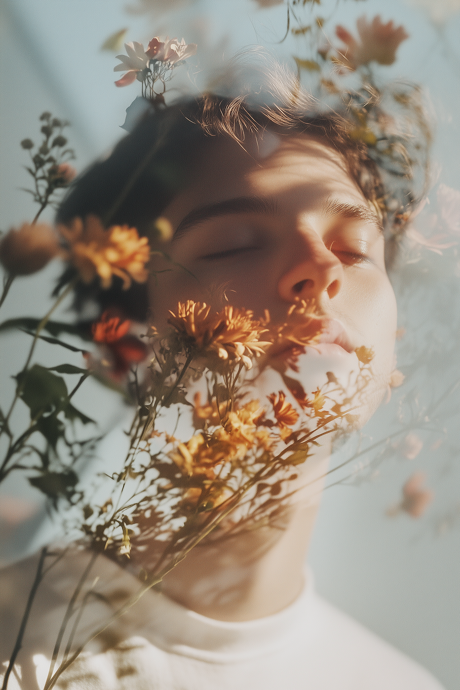 Serene portrait of a young person with closed eyes, surrounded by delicate flowers in soft sunlight, creating a dreamy, peaceful atmosphere.