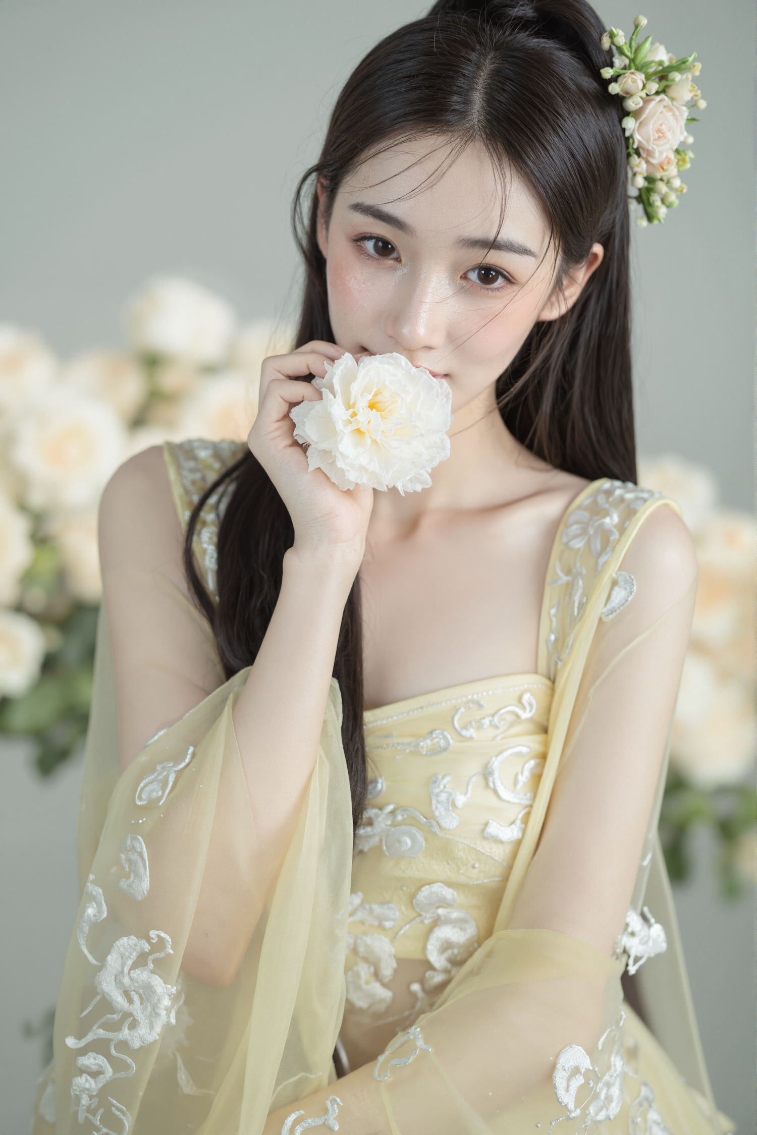 Elegant woman in a yellow embroidered dress holding a white flower, with floral hairpiece and soft, romantic background.