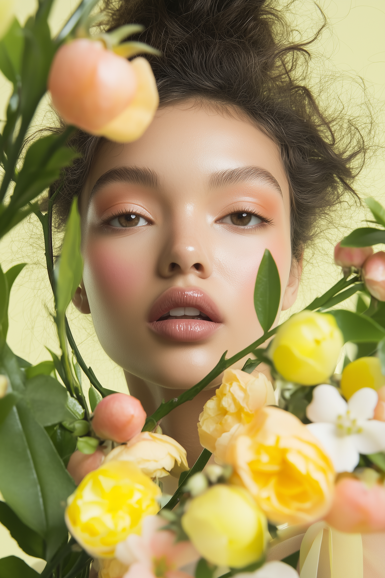A young woman with curly hair surrounded by vibrant yellow and peach flowers, set against a soft yellow background.