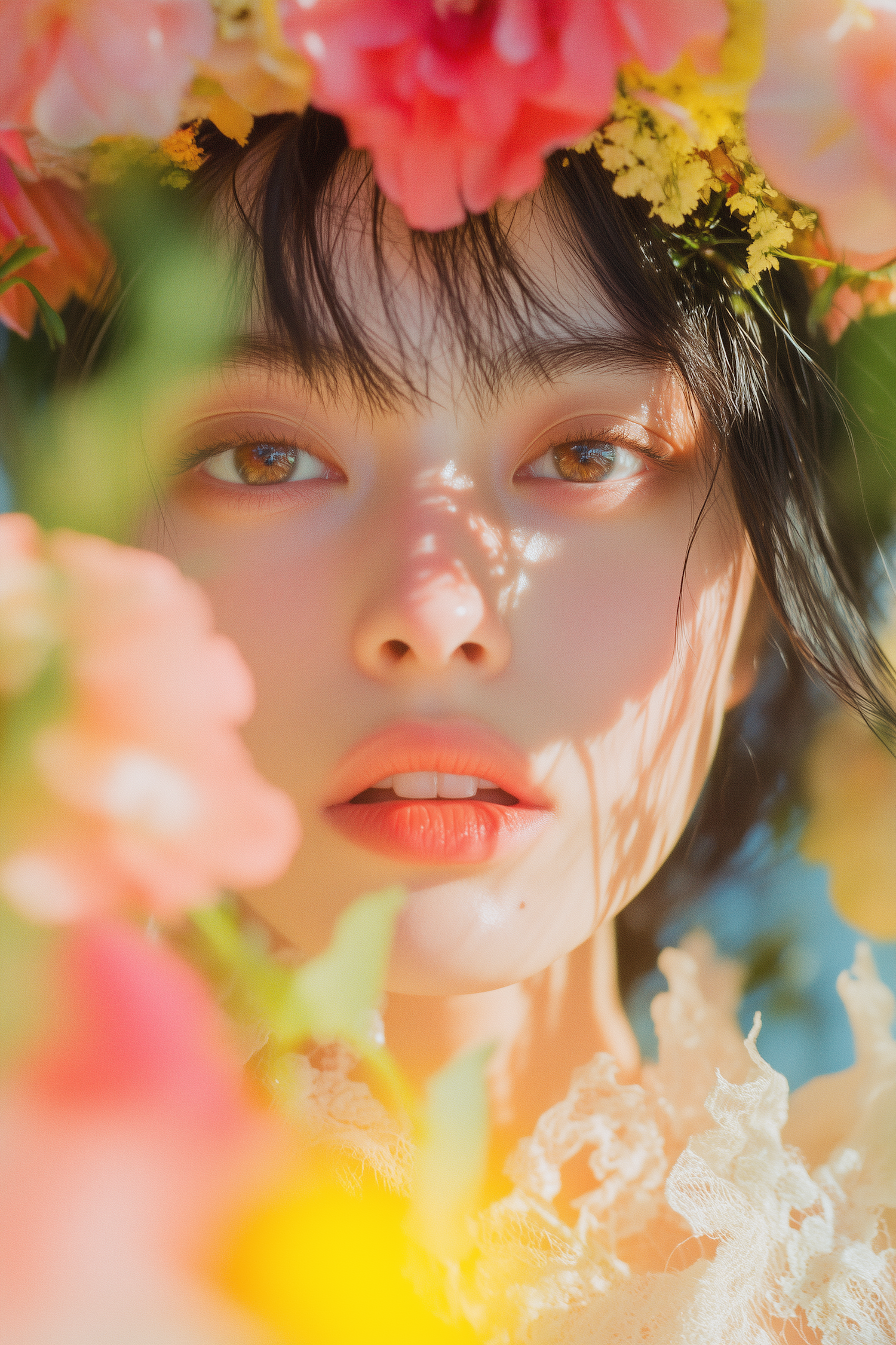 Close-up portrait of an Asian woman with flowers, soft sunlight, and serene expression, creating a dreamy and ethereal atmosphere.