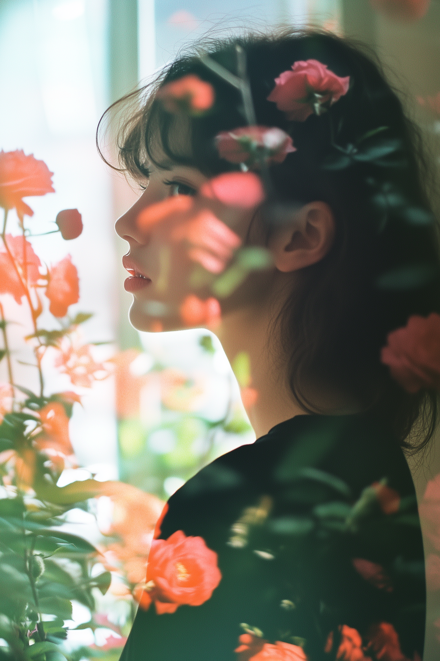 A serene portrait of a young woman surrounded by vibrant flowers, creating a dreamy, layered effect with soft lighting.