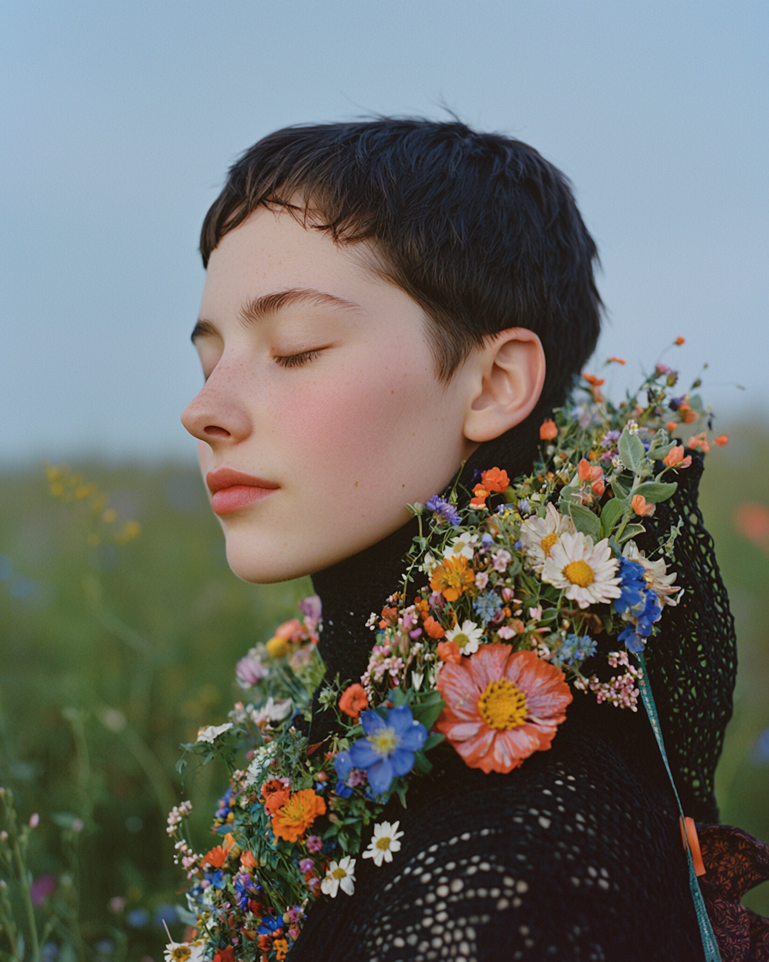 A serene portrait of a woman with short dark hair, vibrant flowers draped around her shoulders, and a peaceful outdoor setting.