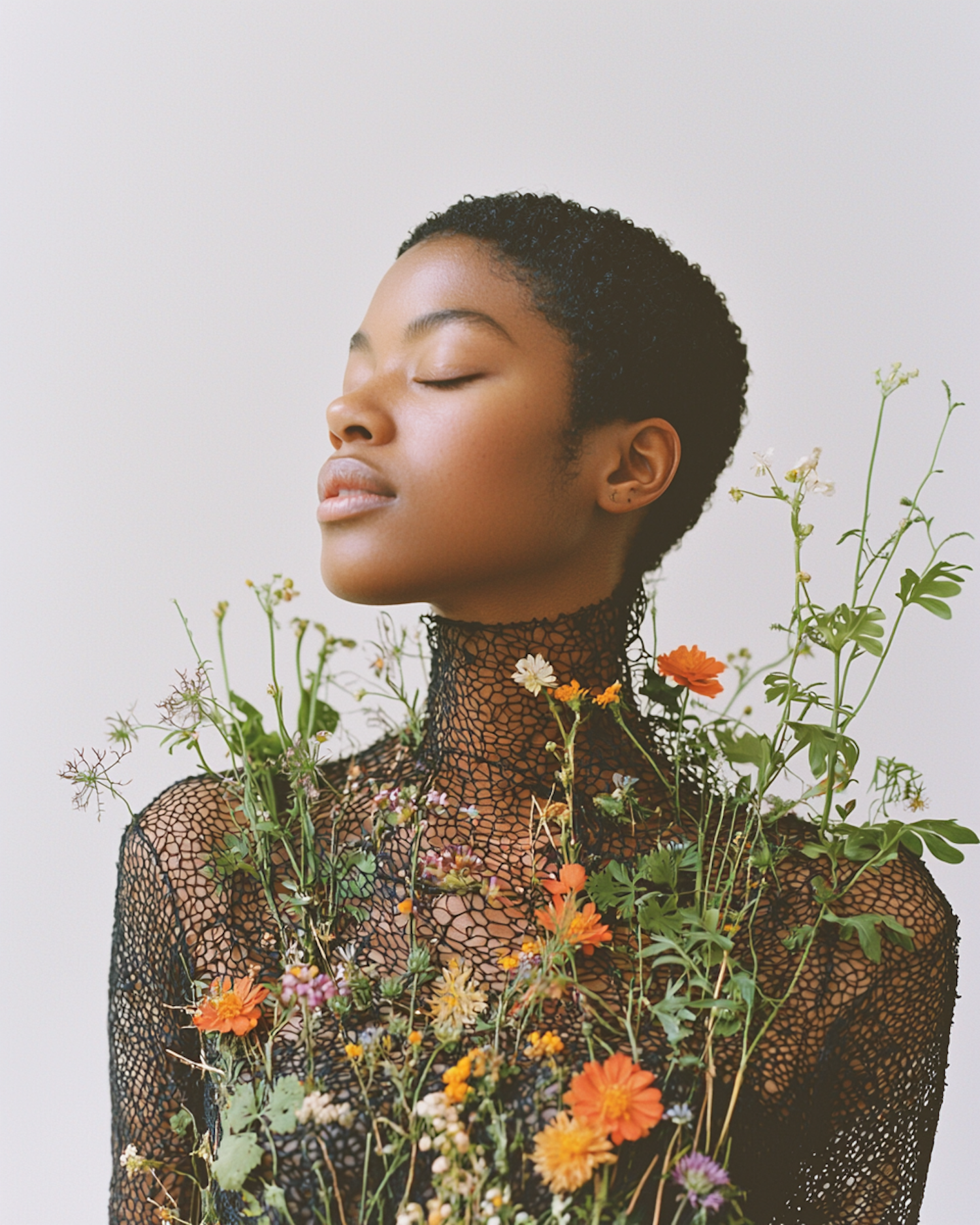 A serene portrait of a woman in black lace adorned with vibrant wildflowers, set against a soft white background.