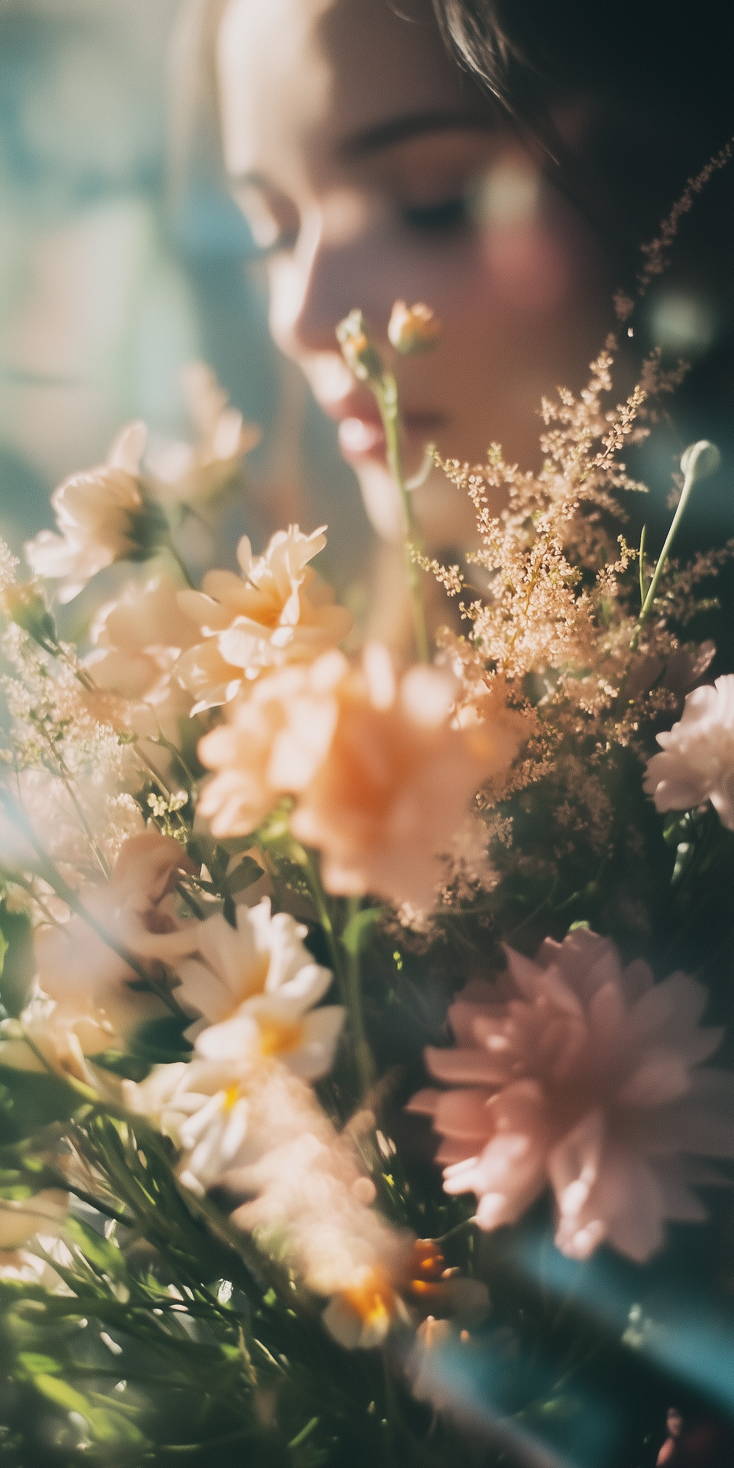 A dreamy portrait of a woman surrounded by soft pink and cream flowers, bathed in warm sunlight, creating an ethereal atmosphere.