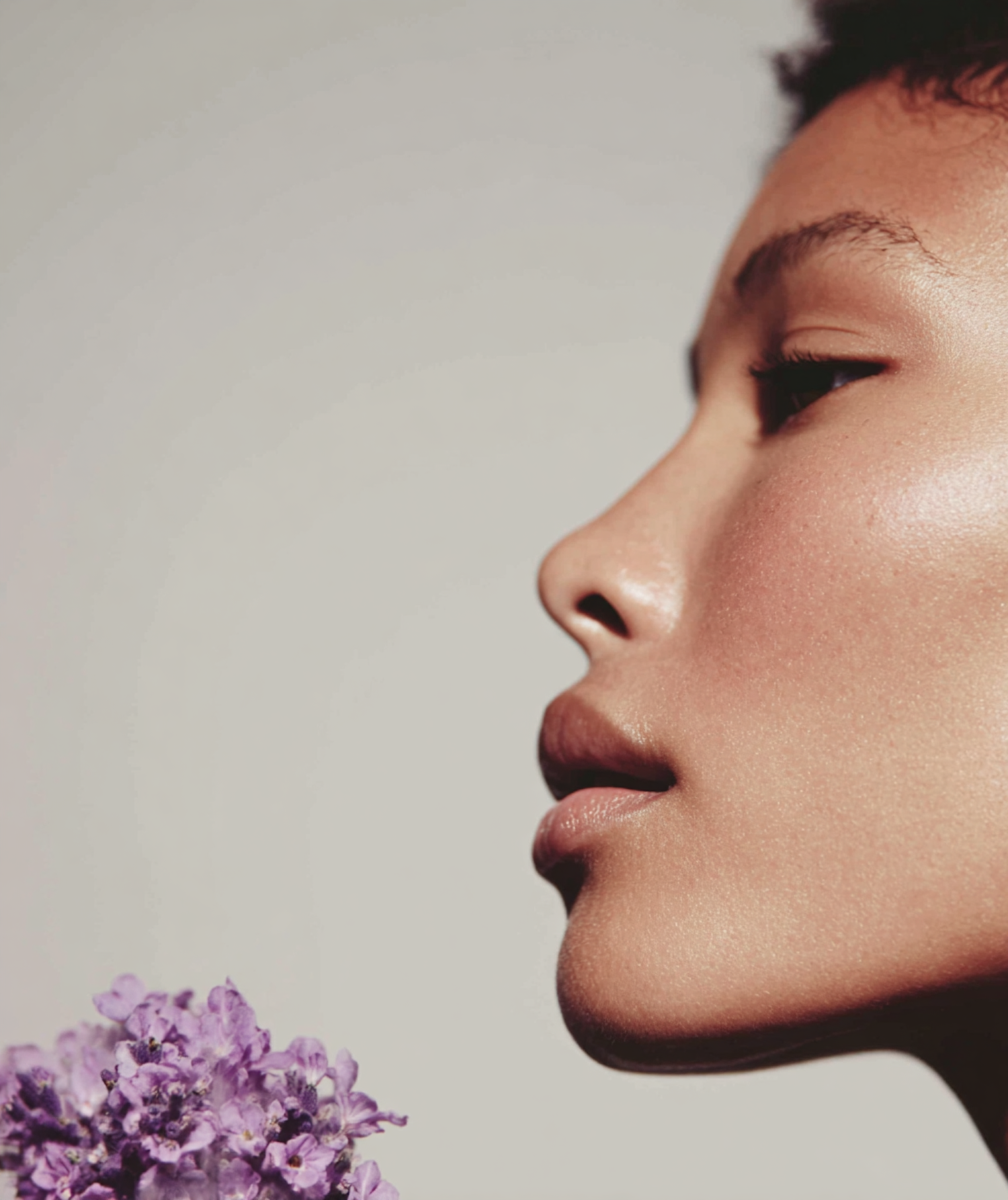 Close-up profile of a person with glowing skin holding purple flowers, set against a neutral background for a serene and elegant look.