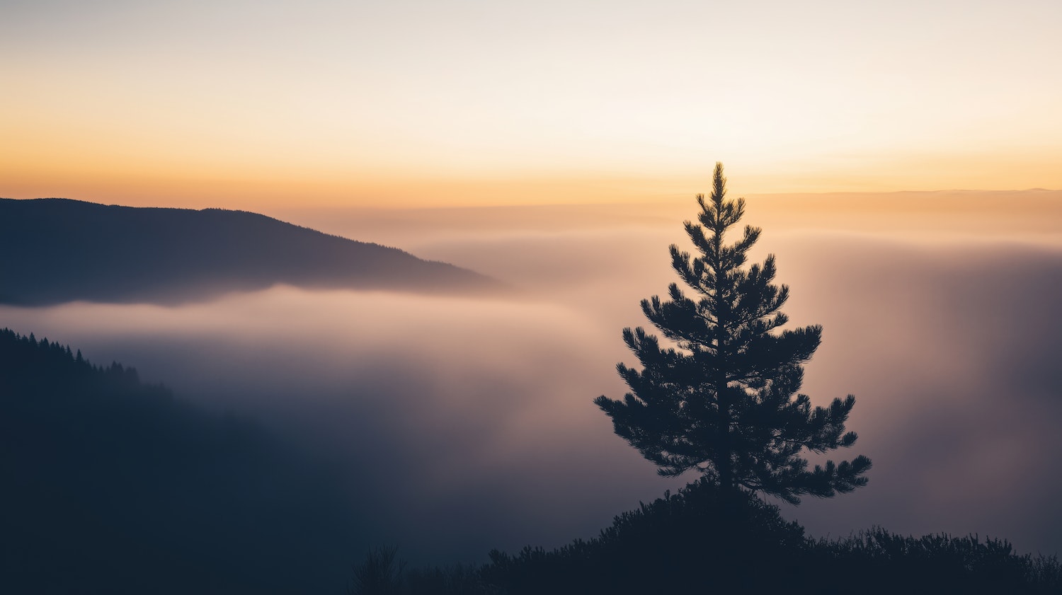 A lone pine tree silhouetted against a foggy valley and a glowing orange sky, creating a tranquil and dreamy mountain landscape.