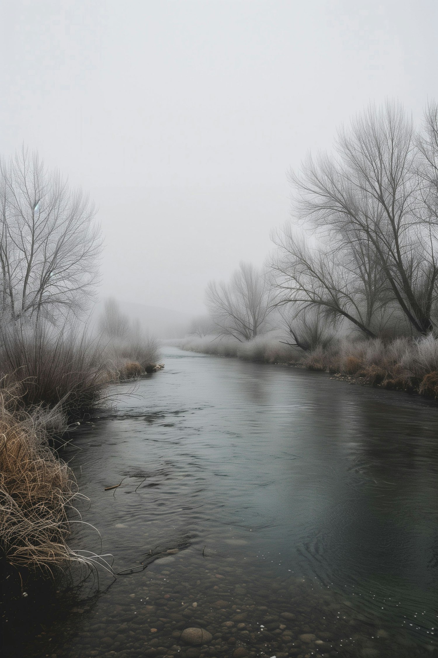 A tranquil river scene with misty trees and frosty grasses, creating a serene winter atmosphere with muted colors and gentle reflections.