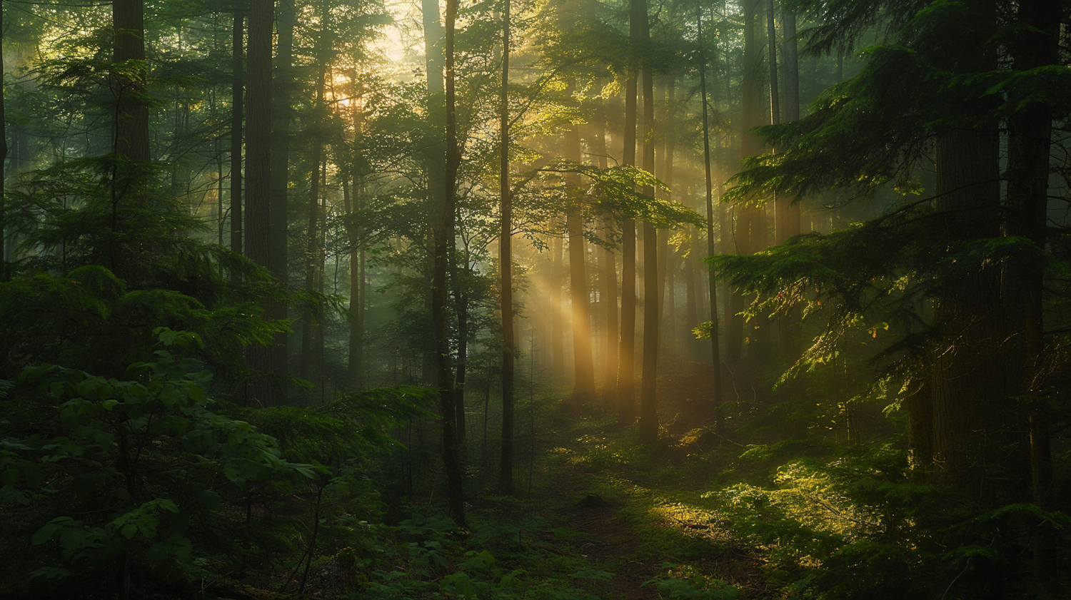 Sunlight streams through a misty forest, illuminating lush green foliage and creating a serene, mystical atmosphere.