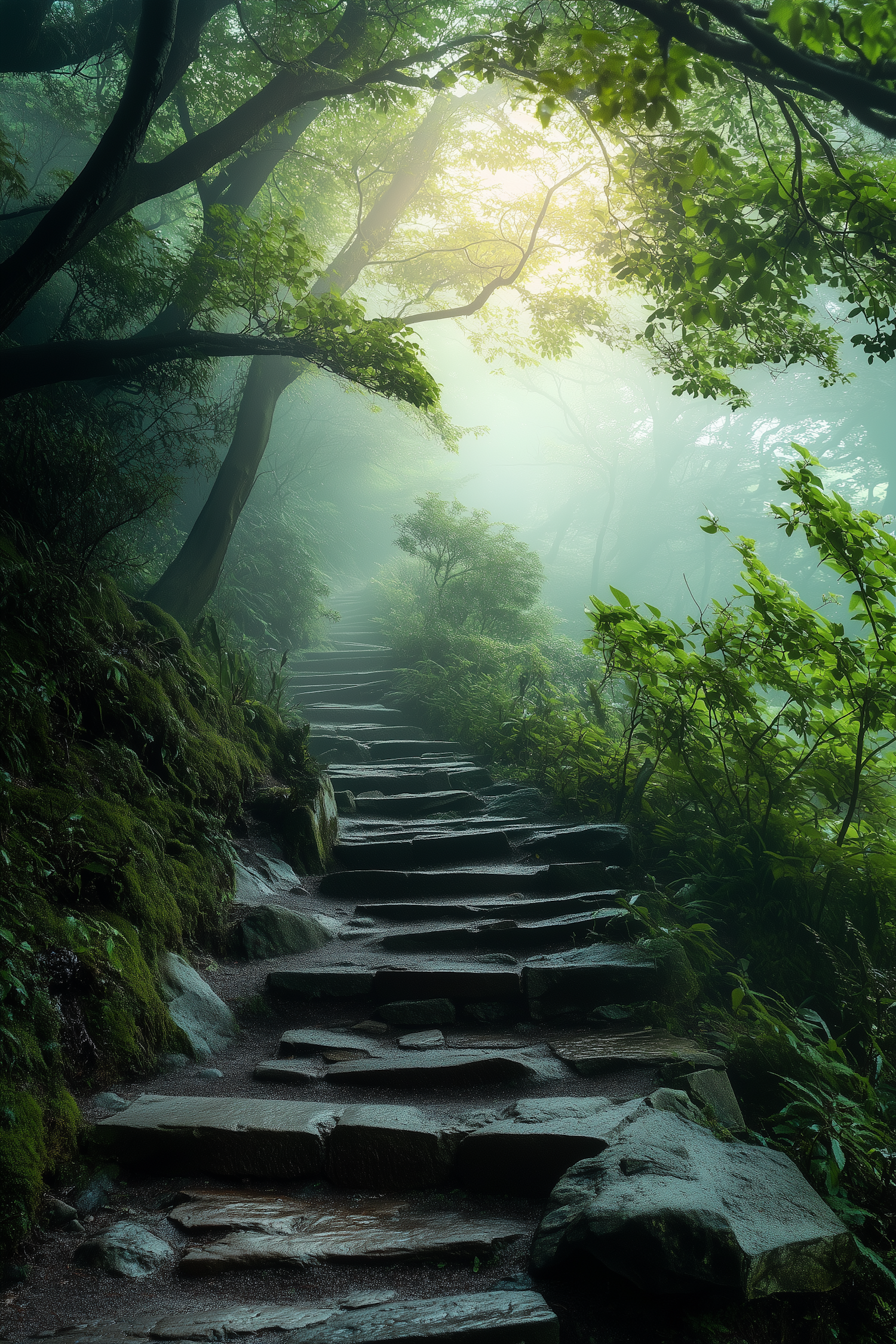 Moss-covered stone steps lead through a lush, sunlit forest, creating a serene and mystical atmosphere.