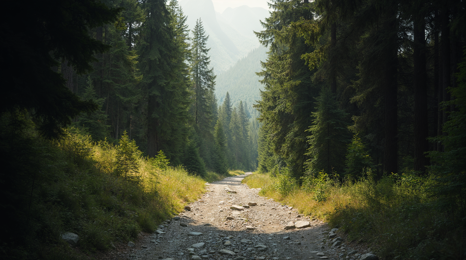 A tranquil forest path with towering evergreens and distant mountains, bathed in soft sunlight and dappled shadows.