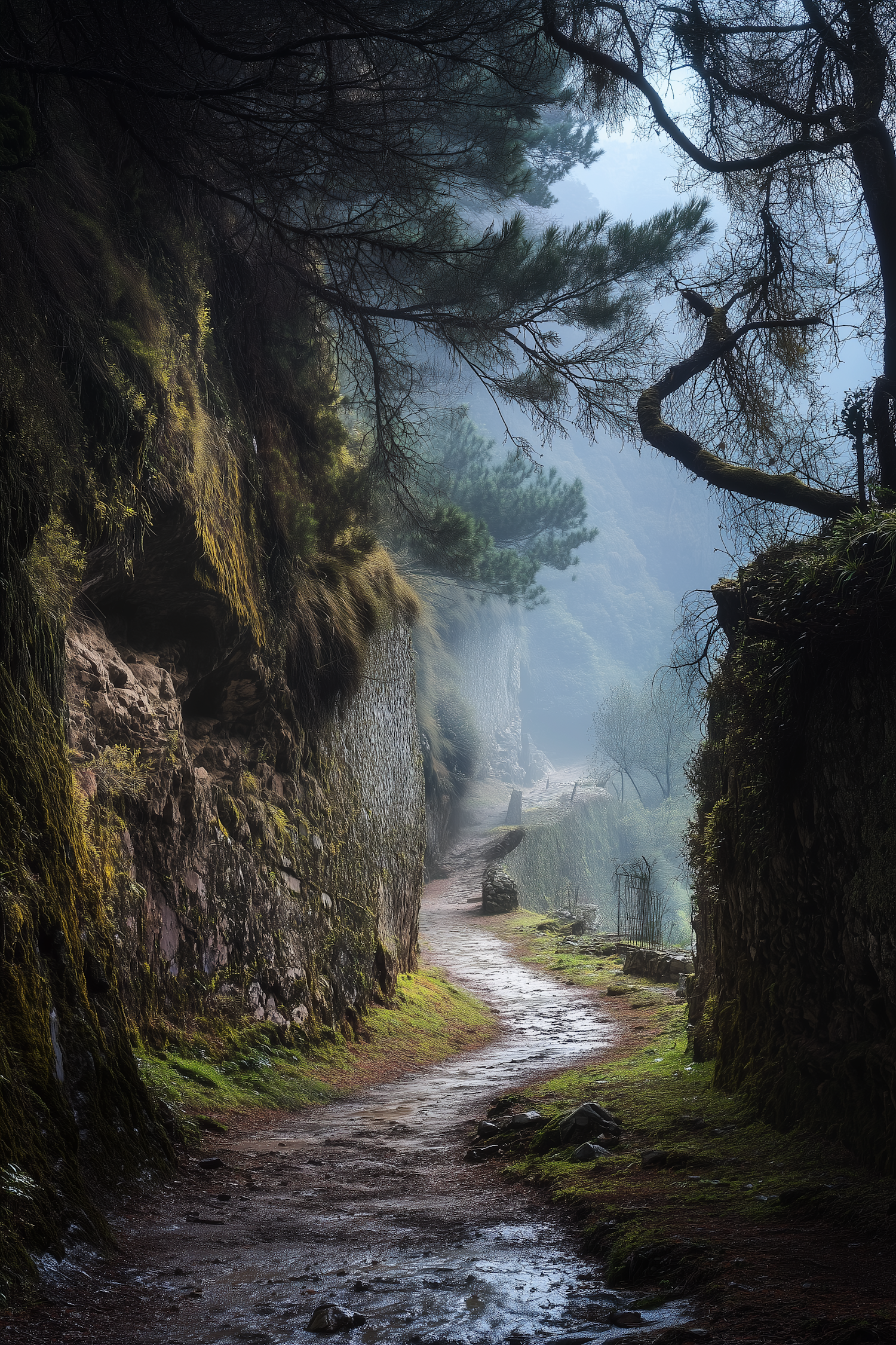 Misty forest path with moss-covered rocks and overhanging branches, creating a serene and mystical atmosphere.