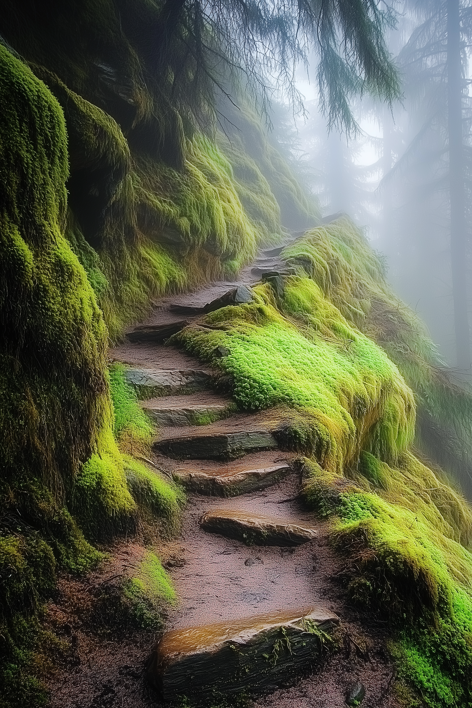 Explore a mystical forest path with moss-covered stones and misty air, creating an enchanting and tranquil atmosphere.