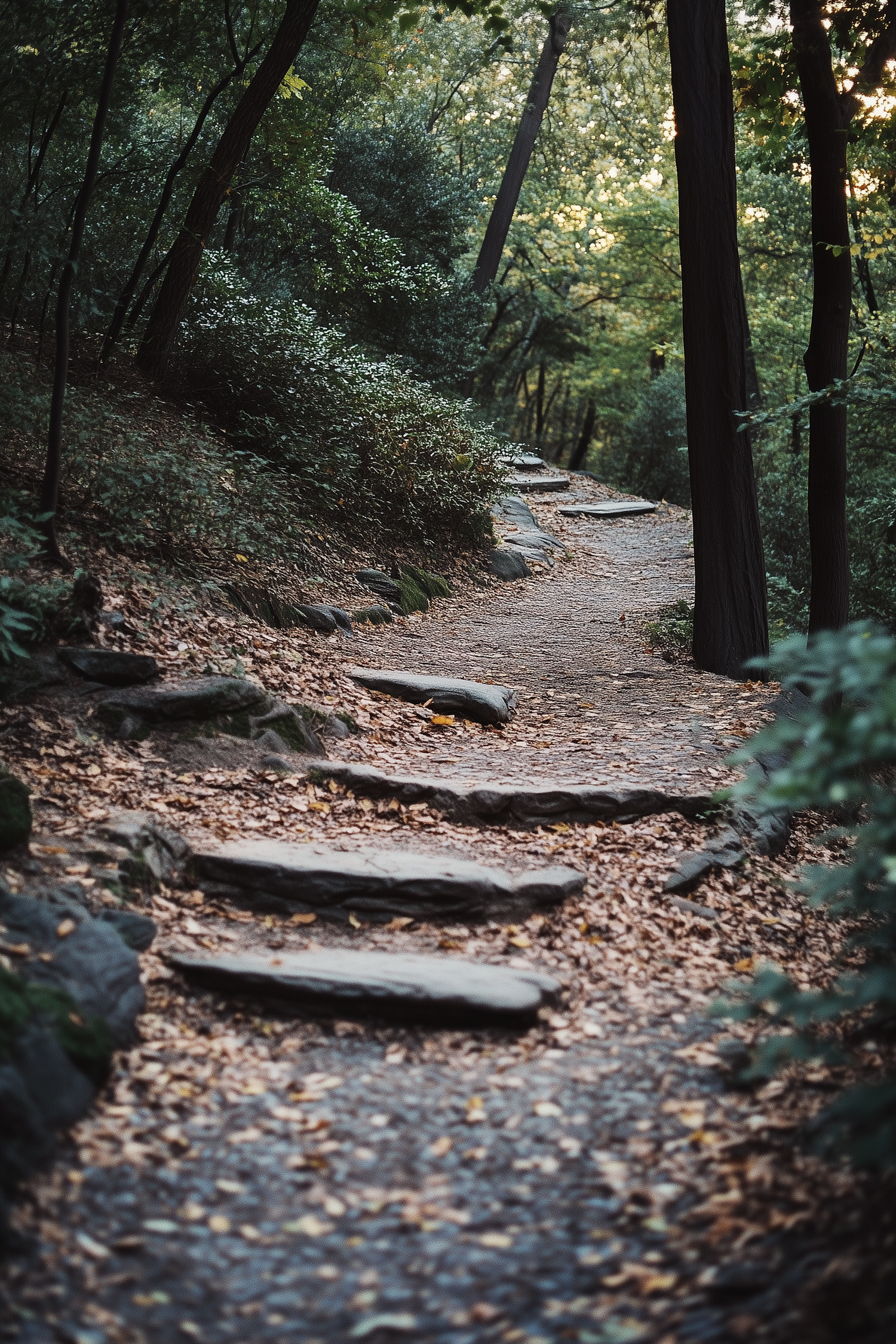A tranquil forest path with stone steps and fallen leaves, surrounded by lush greenery and tall trees, perfect for a peaceful walk.