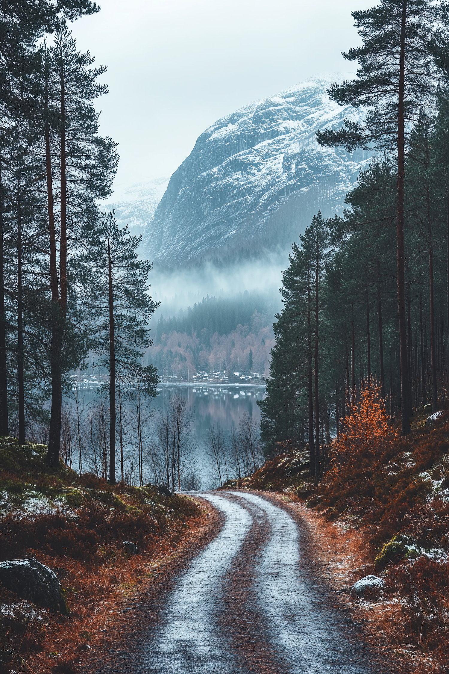 Winding forest road with autumn foliage, misty lake, and snow-capped mountain under an overcast sky. Serene and picturesque.