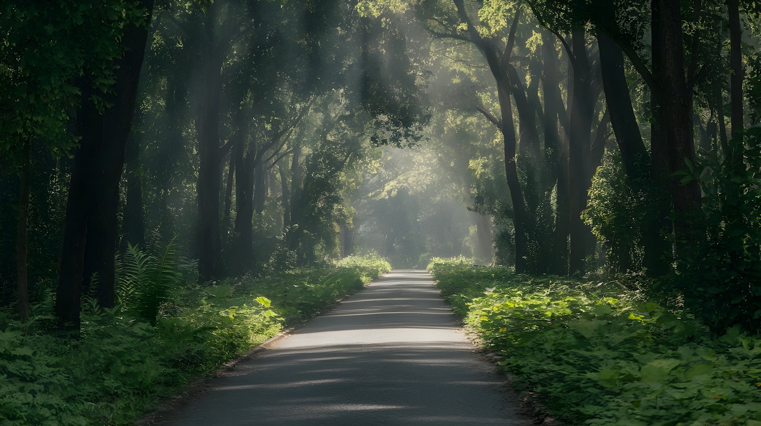 A tranquil forest path with sunlight streaming through dense trees, creating a serene and picturesque natural setting.