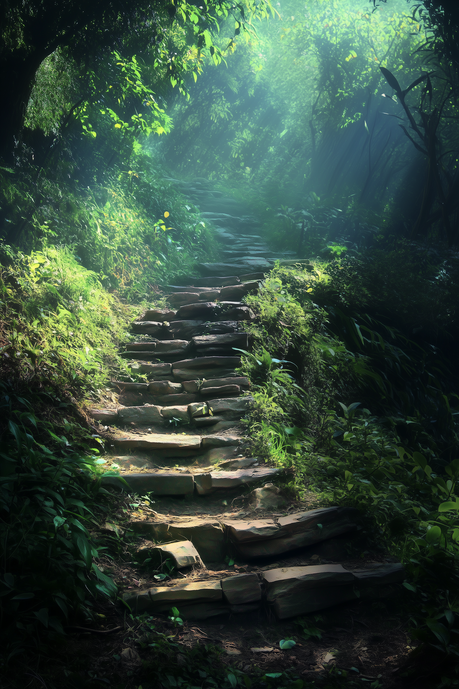 Enchanting forest path with stone steps, dappled sunlight, and lush greenery, creating a serene and mystical atmosphere.