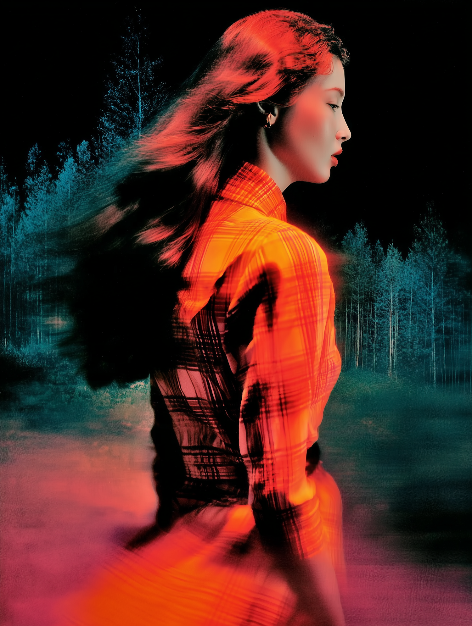 A vibrant portrait of a woman in a plaid outfit, set against a dark forest background with dynamic lighting and motion effects.