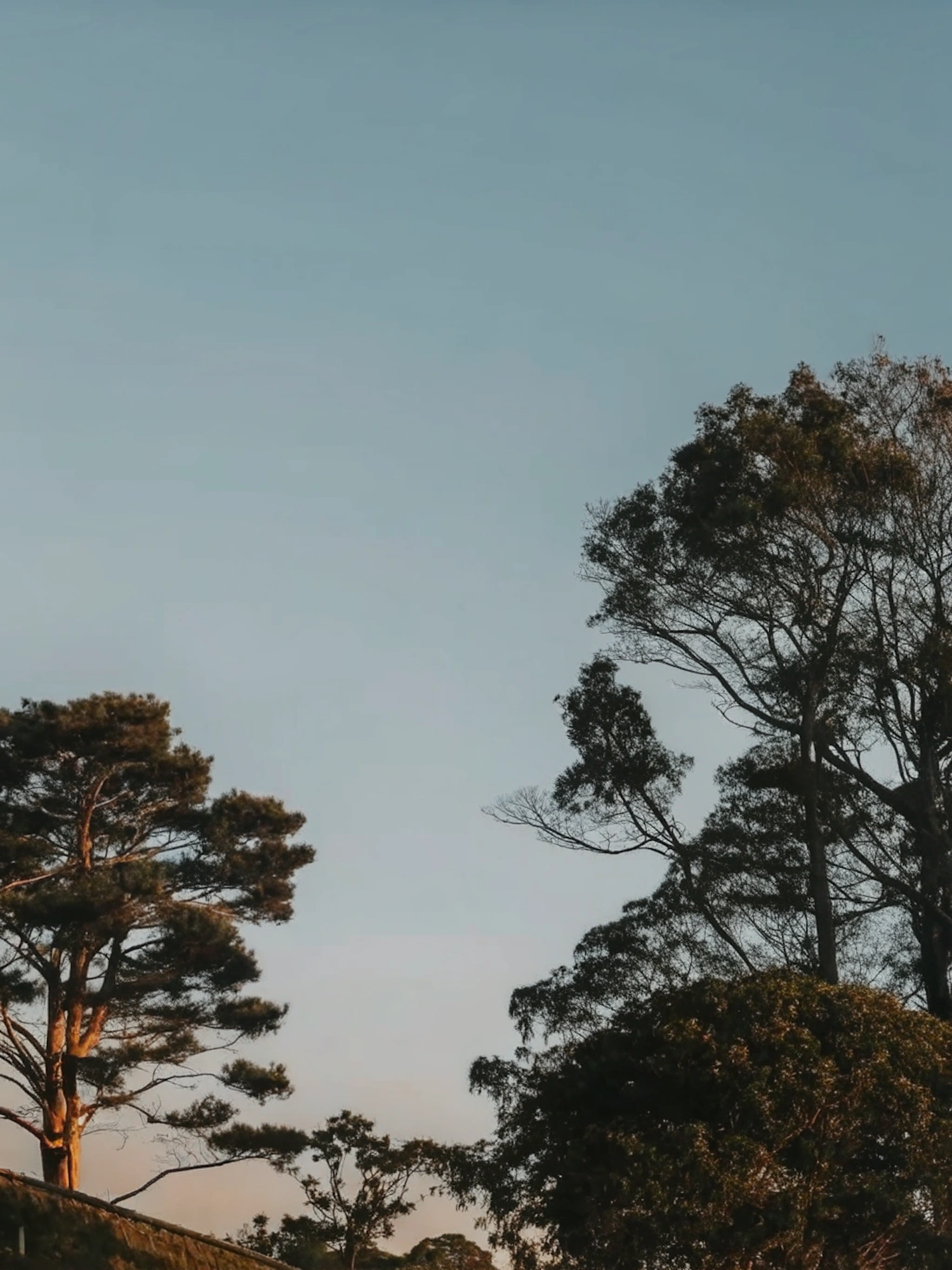 Golden sunlight filters through tall trees against a clear blue sky, creating a serene and tranquil natural scene.