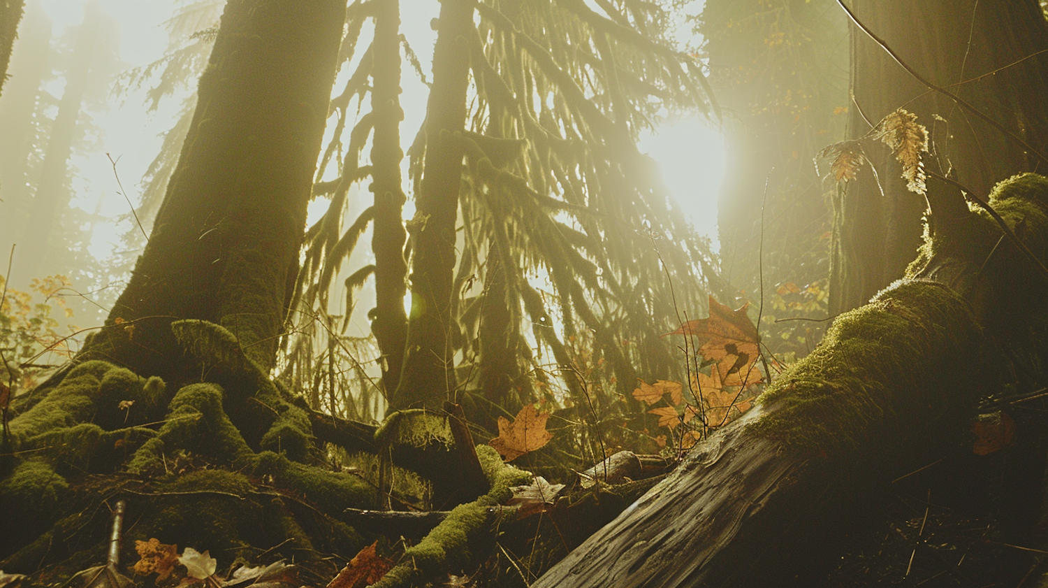 Moss-covered forest with golden sunlight filtering through trees, creating a mystical and serene atmosphere with autumn leaves scattered on the ground.