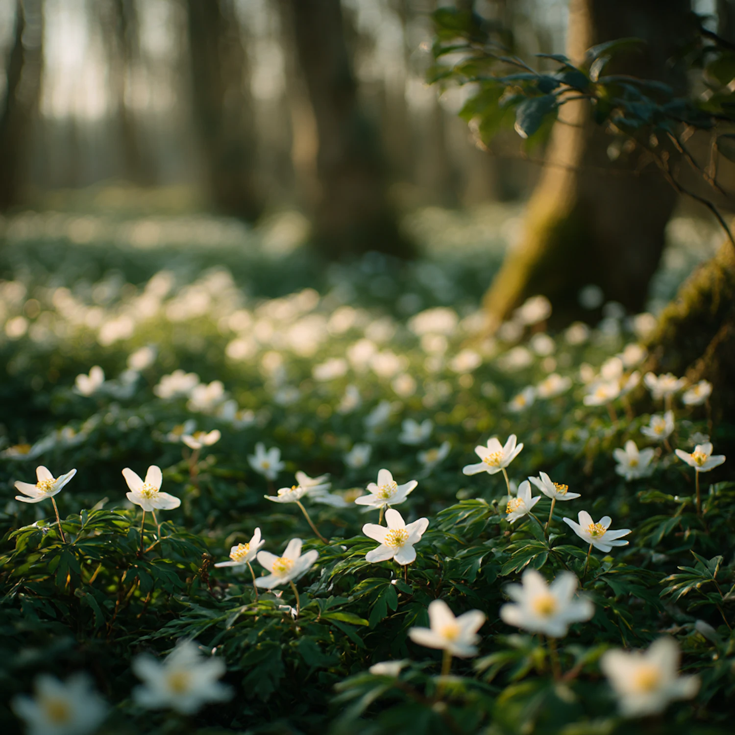 A peaceful forest floor covered in blooming white flowers under soft sunlight filtering through the trees.