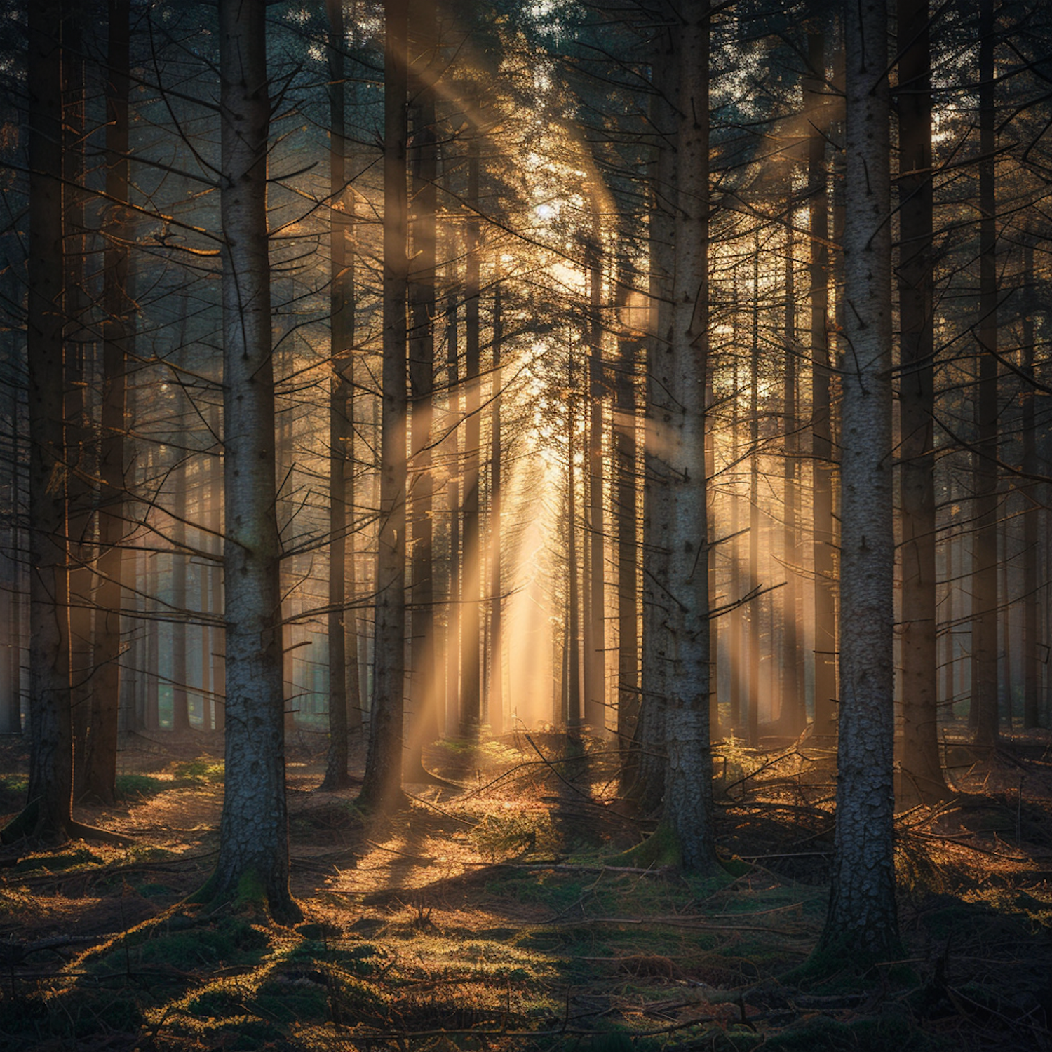 Sunlight streams through a dense forest, casting golden beams and creating a serene, magical atmosphere among tall trees.