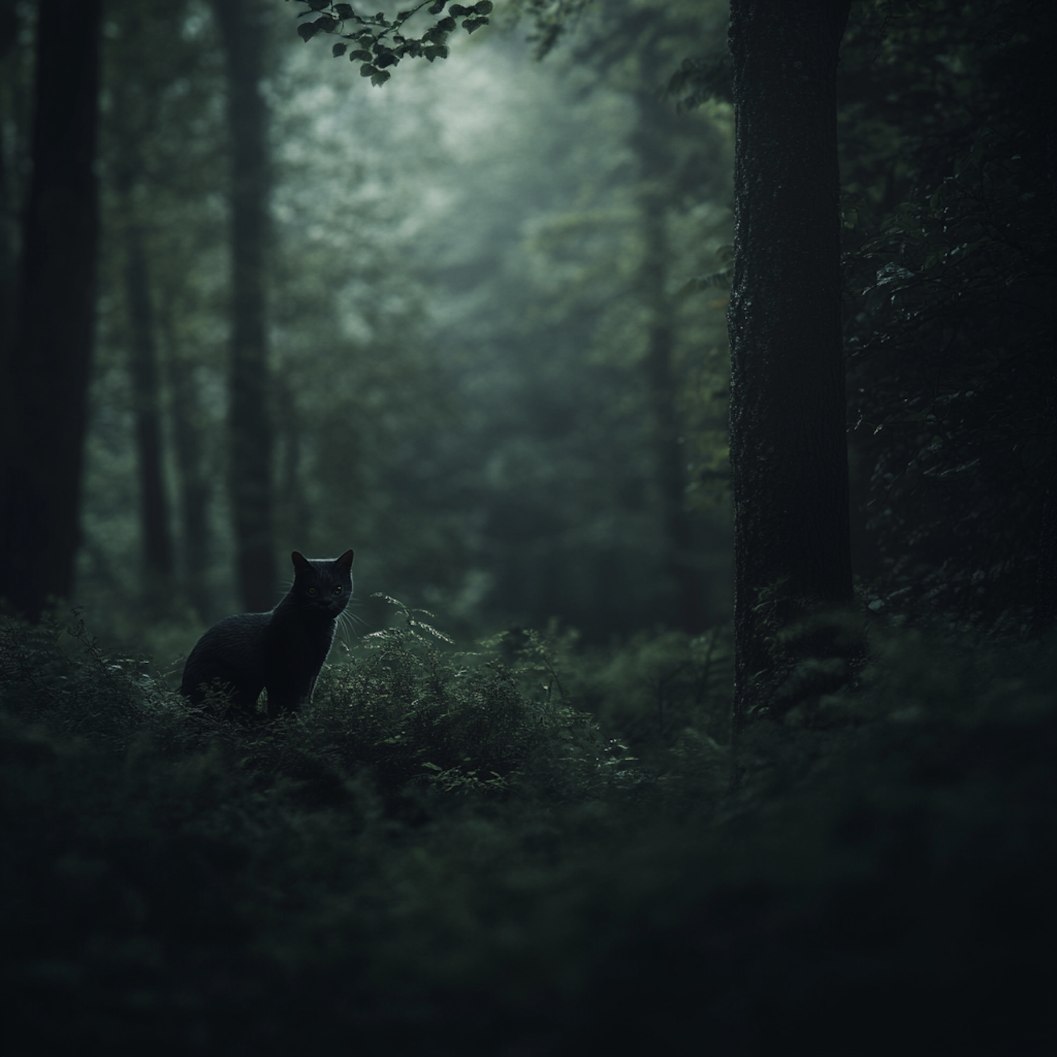 A black cat stands alert in a misty, dimly lit forest, surrounded by lush green foliage and tall trees, creating a mysterious atmosphere.