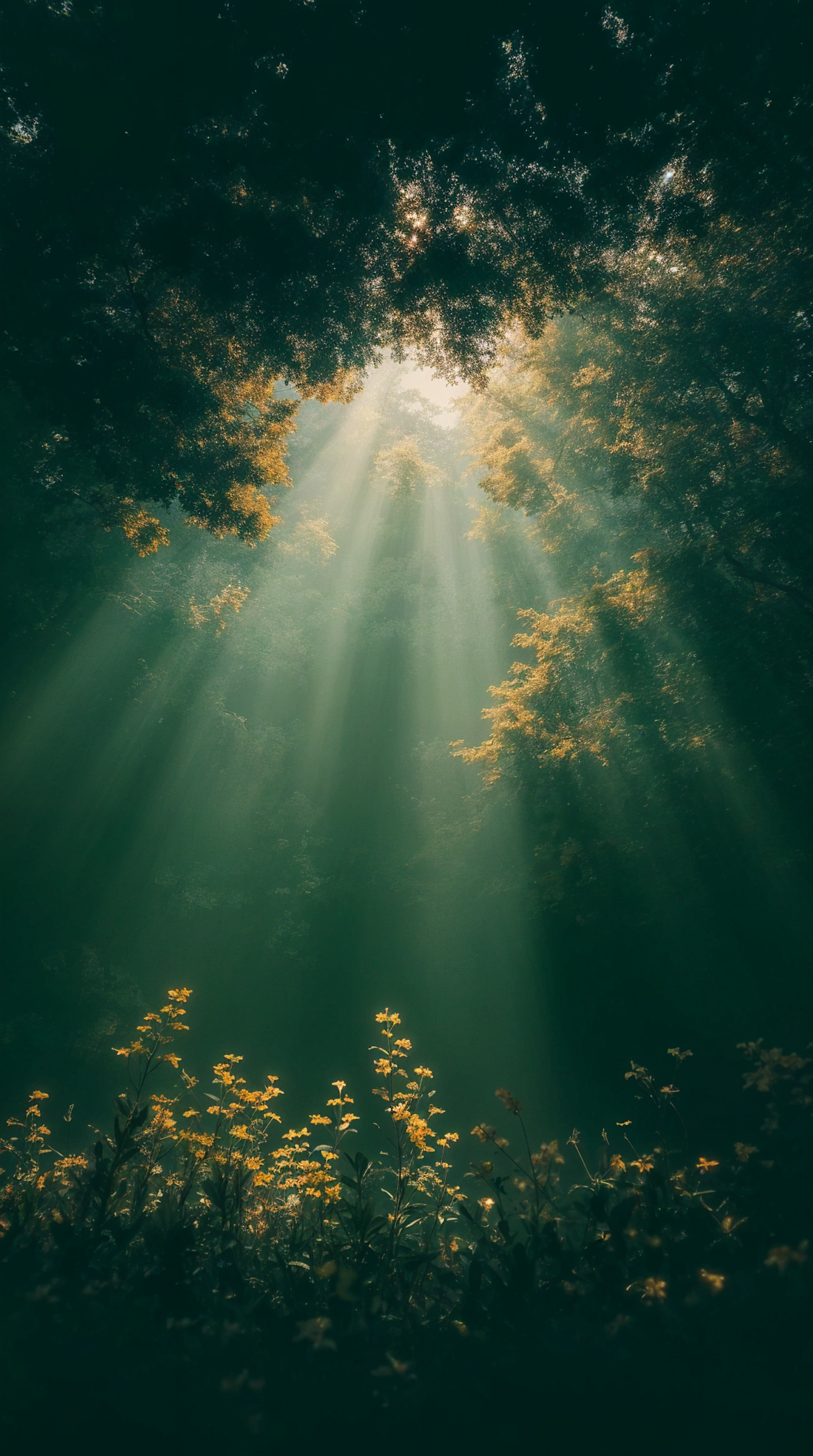 Sunlight streams through a forest canopy, illuminating yellow wildflowers below. A serene, mystical woodland scene.
