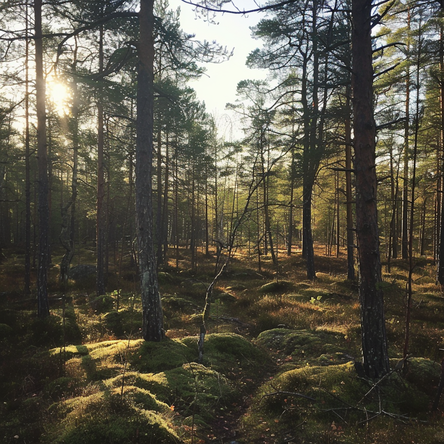 Sunlit forest with tall trees and lush mossy ground, creating a serene and tranquil natural landscape.
