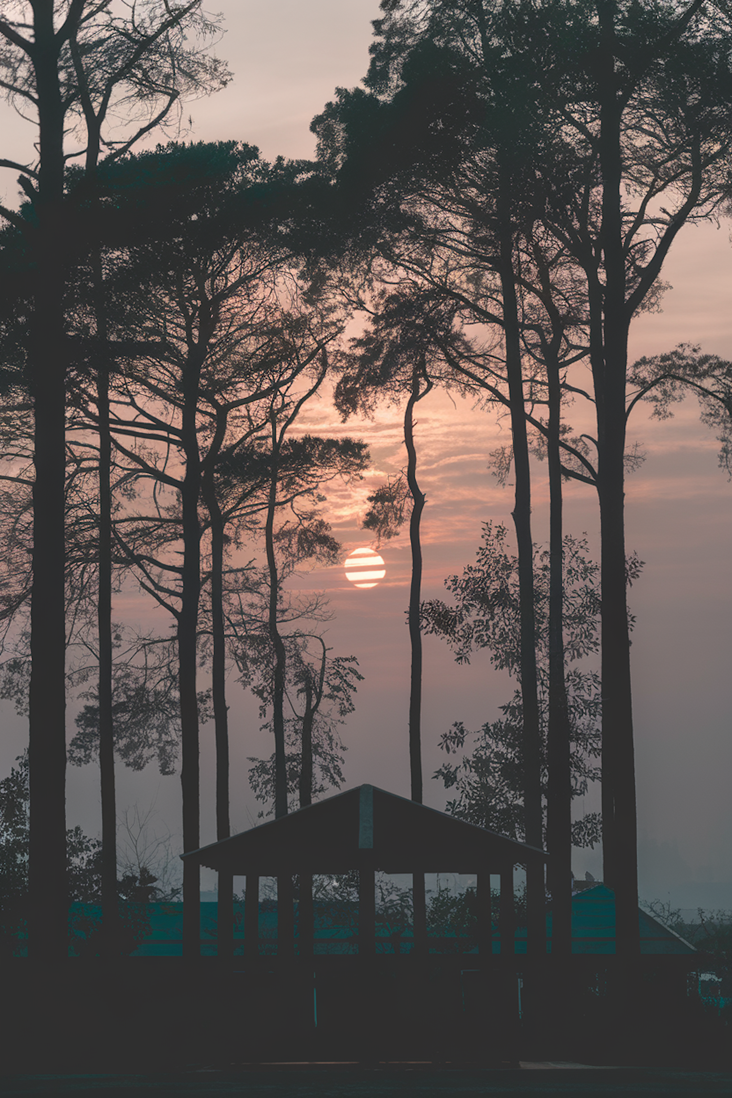 Serene sunset framed by tall trees and a silhouetted pavilion, with soft orange and pink hues creating a tranquil atmosphere.
