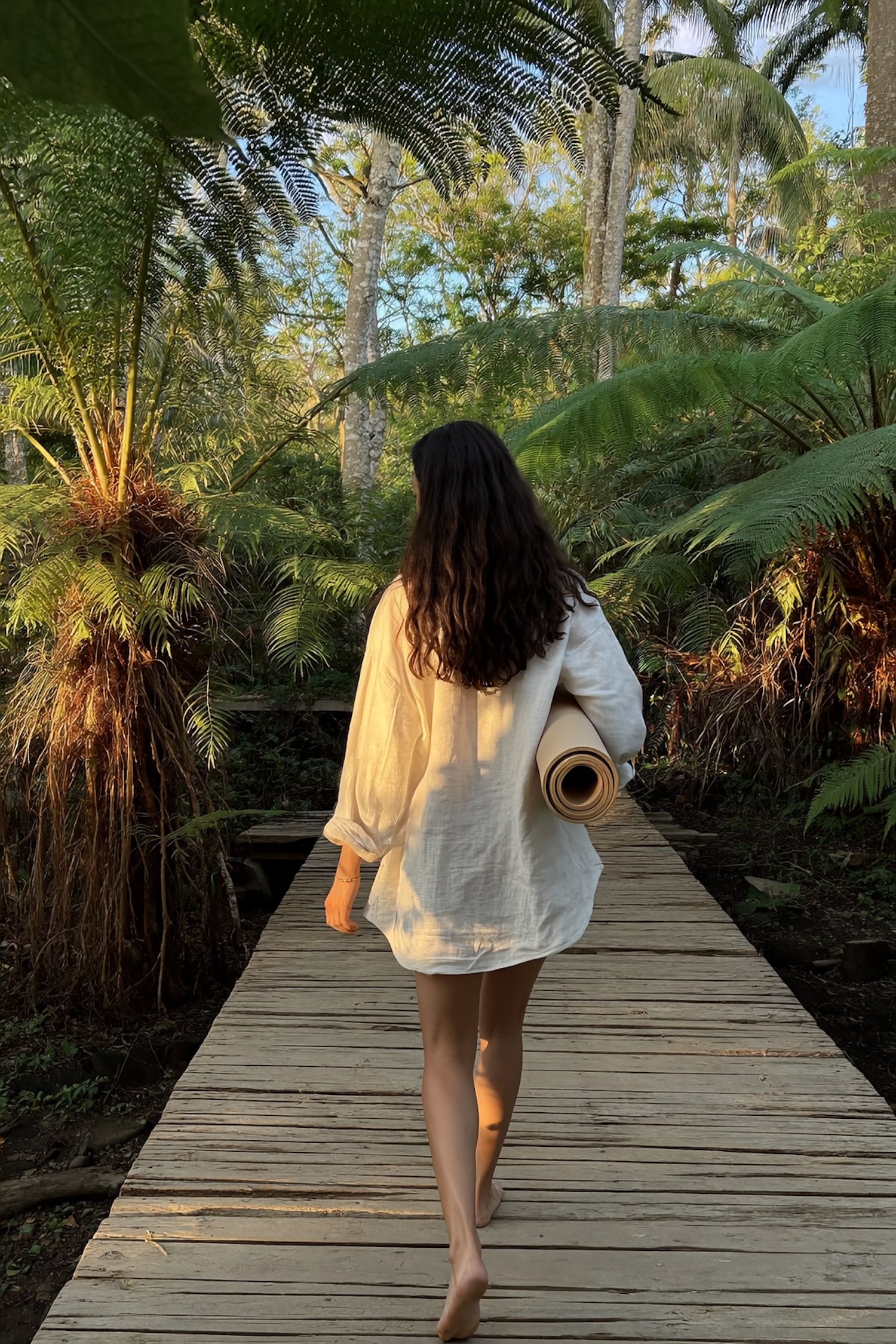 A serene moment of a person walking barefoot on a wooden path in a lush tropical forest, carrying a yoga mat under warm sunlight.