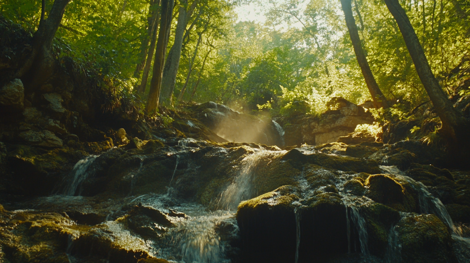 Tranquil forest waterfall with sunlight filtering through lush green trees, creating a serene and peaceful natural scene.