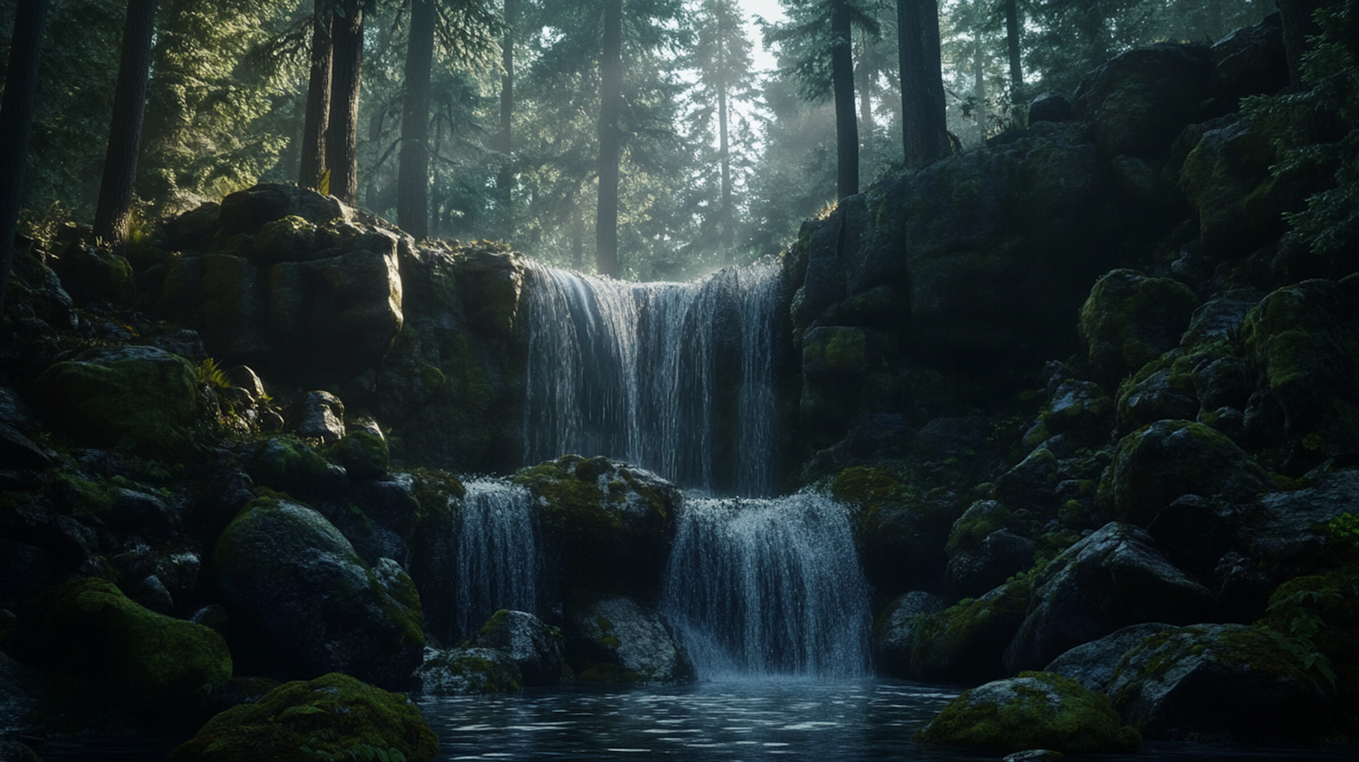 Serene waterfall in a lush forest, surrounded by moss-covered rocks and tall trees, with sunlight filtering through the canopy.