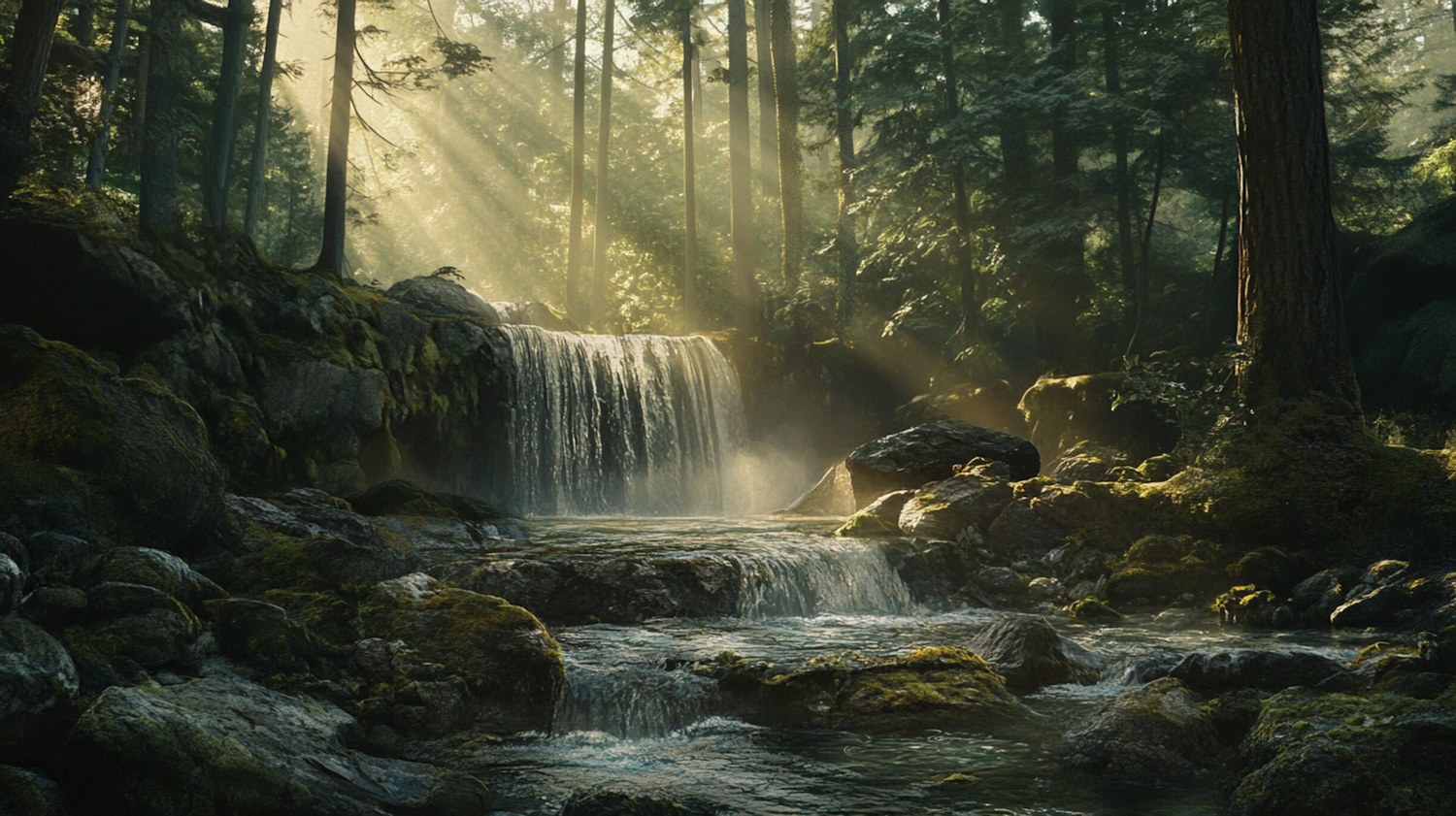 Tranquil forest waterfall with sunlight streaming through trees, mossy rocks, and lush greenery creating a serene natural scene.